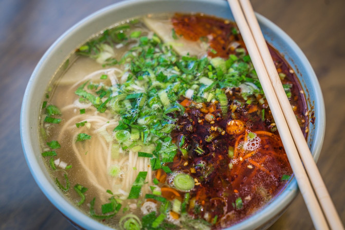 浇过汤头,盛汤师傅用自由体操般的优雅姿势,分别往碗中撒入牛肉丁、香菜末和蒜苗碎,最后浇上一大勺鲜红欲滴的辣椒油后将面交在你的手里。如果你恰巧是个不吃香菜不吃蒜苗不吃辣椒的人并且将这些要求告诉窗口里的师傅,他可能会当场愣在原地泪流满面。