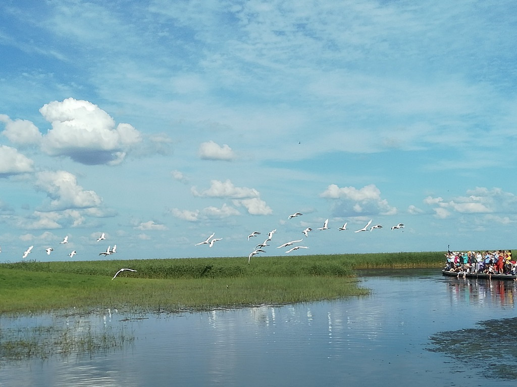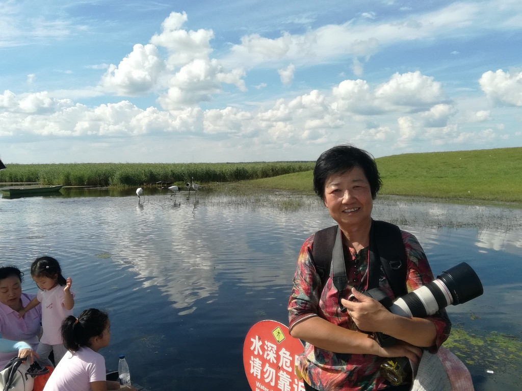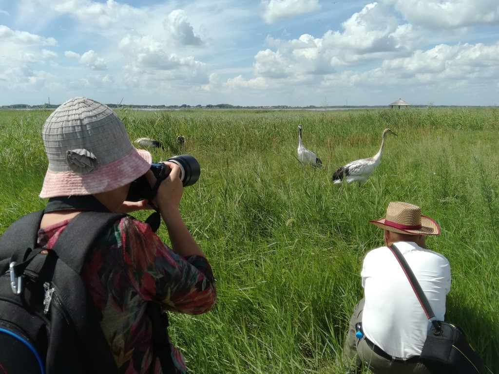 保护区每天有三场丹顶鹤放飞表演,每次约1小时。为此,每天都会吸引了大量的游客前来观看。冒着高温炙烤,我们连续看了两场丹顶鹤放飞表演,煞是过瘾!只是中午的保护区里无遮无挡,确实太热了。为了降温,我们也吃起了“马迭尔”(一种品牌冰棍)。不过这里的热是热中有爽,和我们南方的湿热可不一样哦!
