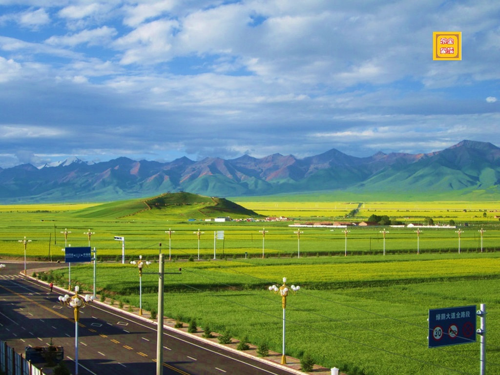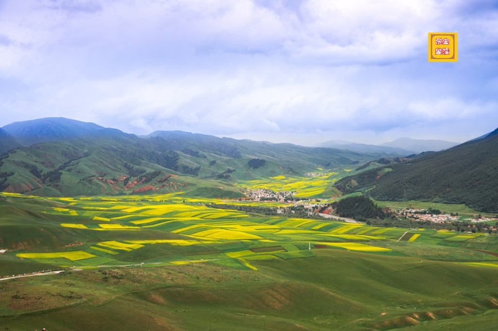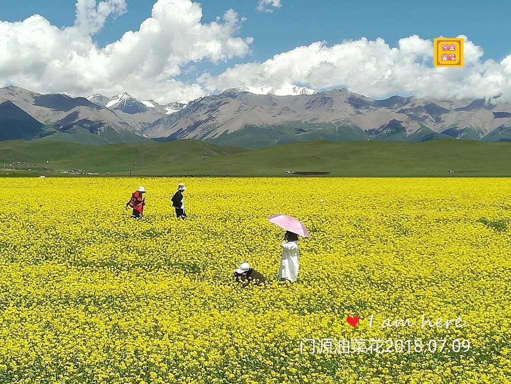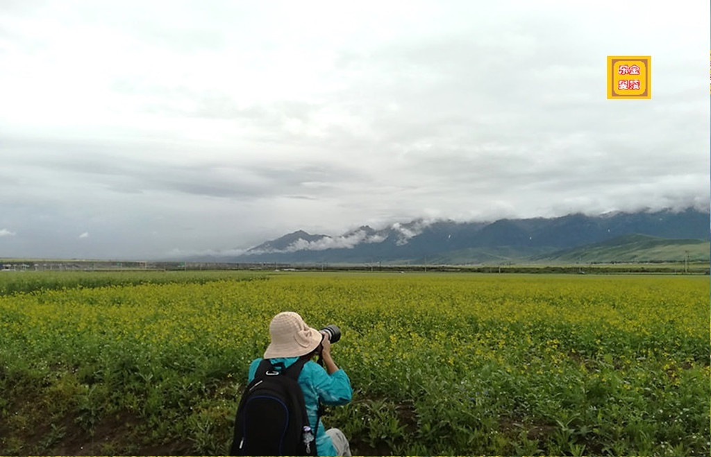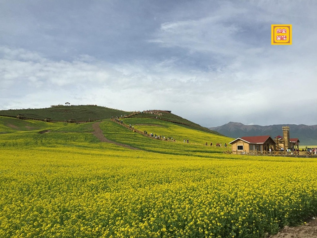 圆山观花台视线极佳,此刻,你站在这里向下俯瞰,油菜花环绕四周,从脚下一直延伸到远方;眼前的冷龙岭、达坂山、岗什卡群山挺立,远山如黛,山峰依稀白雪;山下的村落和树木点缀其间、道路与田埂形成蜿蜒的曲线;山上山下姿态翻滚着流云,青涩带黄的的油菜花在浩门河谷中一望无际。天际与云朵、花地与群山、村庄与原野、穿着五颜六色的人们……构成了一幅幅祁连山下的绮丽画卷。