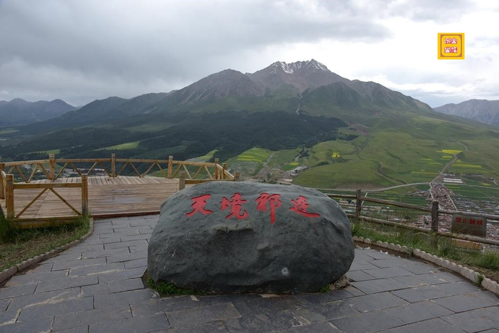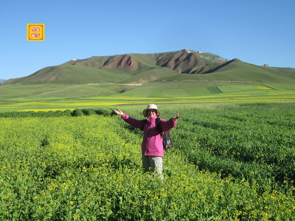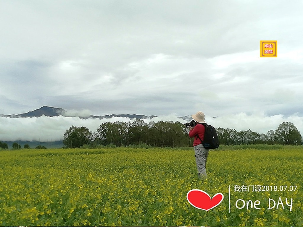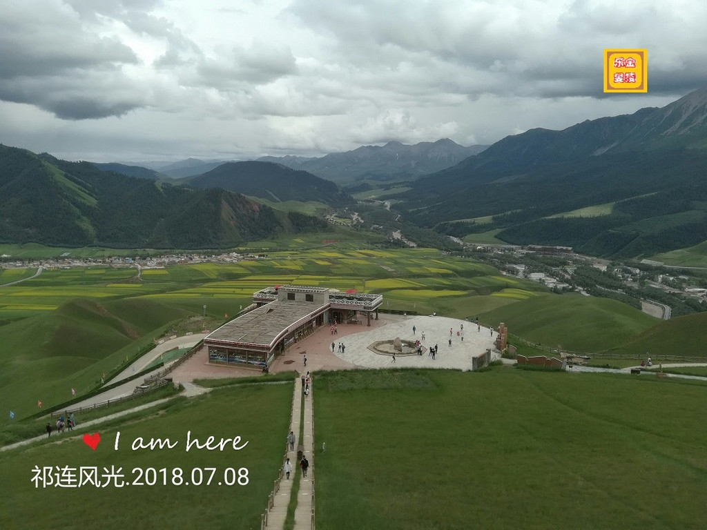 圆山观花台视线极佳,此刻,你站在这里向下俯瞰,油菜花环绕四周,从脚下一直延伸到远方;眼前的冷龙岭、达坂山、岗什卡群山挺立,远山如黛,山峰依稀白雪;山下的村落和树木点缀其间、道路与田埂形成蜿蜒的曲线;山上山下姿态翻滚着流云,青涩带黄的的油菜花在浩门河谷中一望无际。天际与云朵、花地与群山、村庄与原野、穿着五颜六色的人们……构成了一幅幅祁连山下的绮丽画卷。