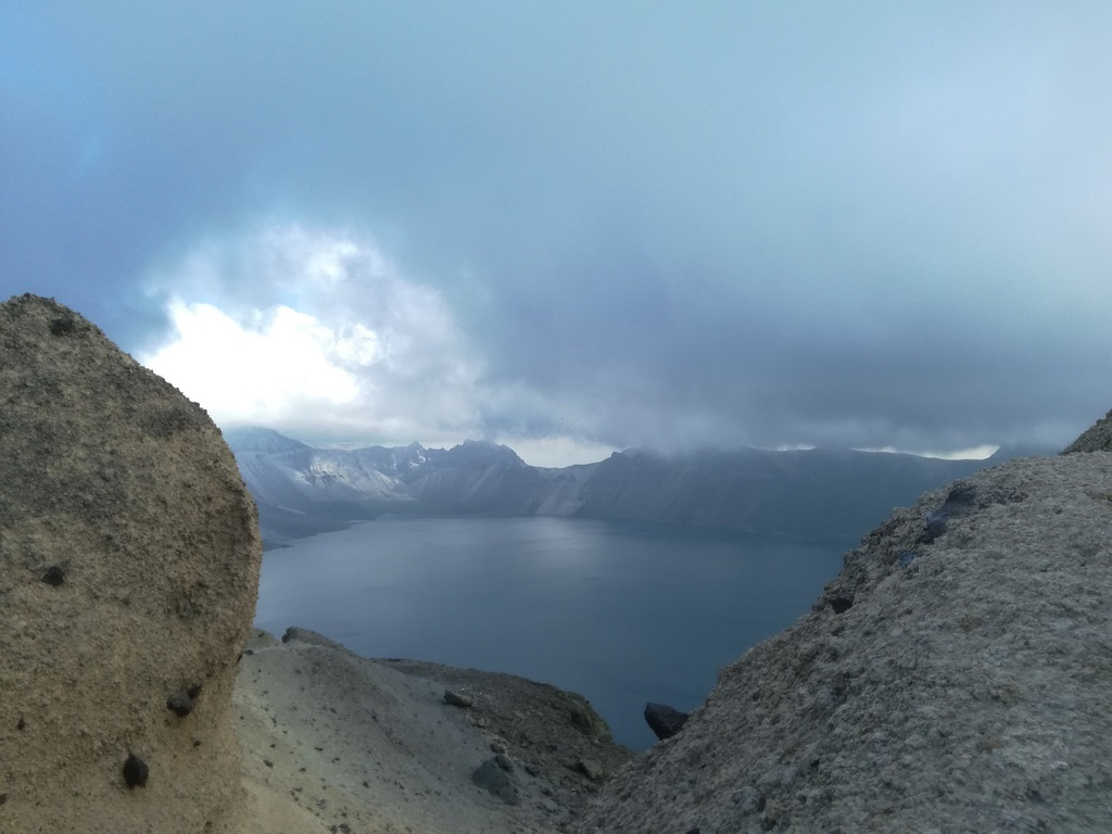 这些天池岸边垒起的巨大石块,就是当年火山喷发时的岩浆堆积而成,由于其火山灰质条件,长白山天池周围寸草不生。它与天山天池的地质地貌完全不同(我们去过天山天池,它是天山谷地一小块绿洲),感觉景色要比天山天池显得原始和苍茫,富有跨越时空之感。