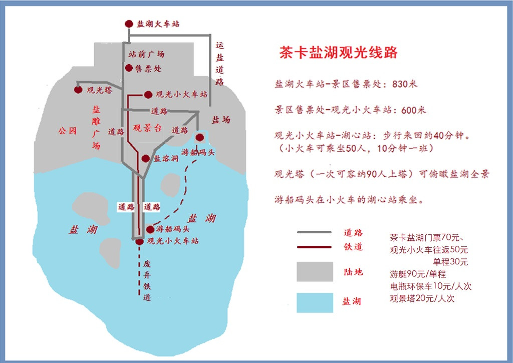 交通情况:西宁乘“天空之境”号专列可当日往返,Y961早晨08:25发车,到达盐湖12:28;Y962下午盐湖发车16:30、到达西宁20:43。如当日往返,可以在盐湖游览4个小时。茶卡盐湖住宿较贵,餐饮条件一般。