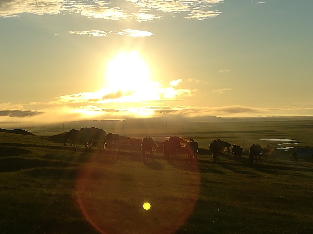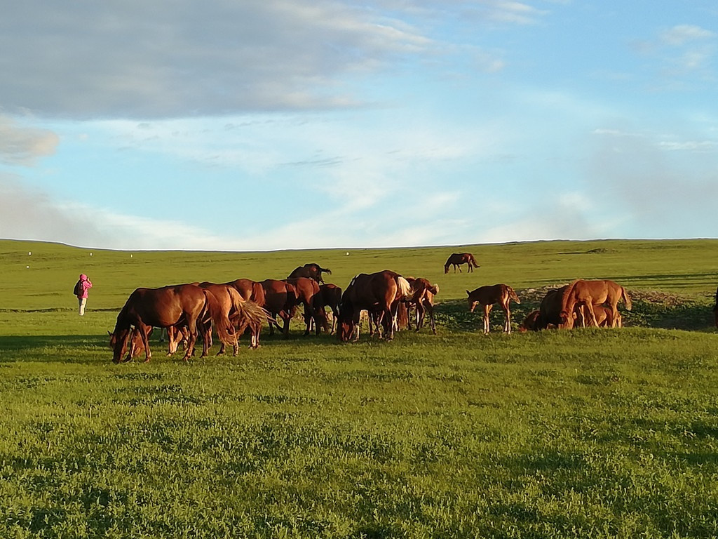 看日出的地方,来了一群“天马”悠闲地从我们身边经过。此时,偌大的呼伦贝尔草原,只有两个人和一群马,连牧马人也不知去哪了啰!