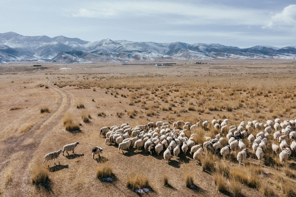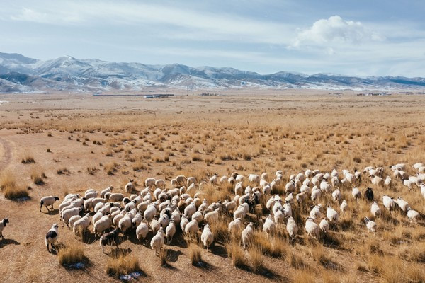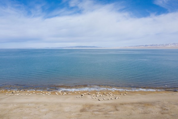 此刻的青海湖没有特别多的冰,湖水依旧非常的蓝。我们把车停在路边上,把无人机放起来,高空的视角下更能凸显青海湖的美丽。羊群和草地形成了一幅绝美的画面。