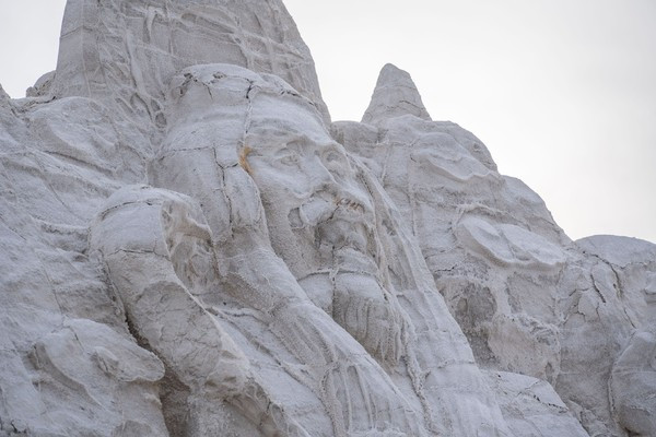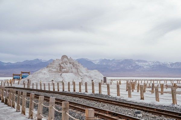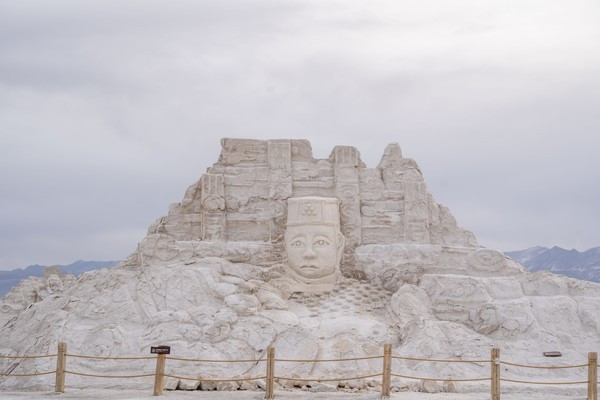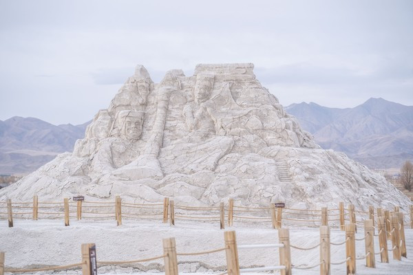 在景区雕塑区你可以看到石雕的盐湖守护女神,除了该雕塑外,其它约十几座巨大的雕塑都是盐雕,有弥勒佛、成吉思汗等造型。