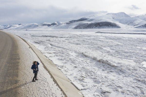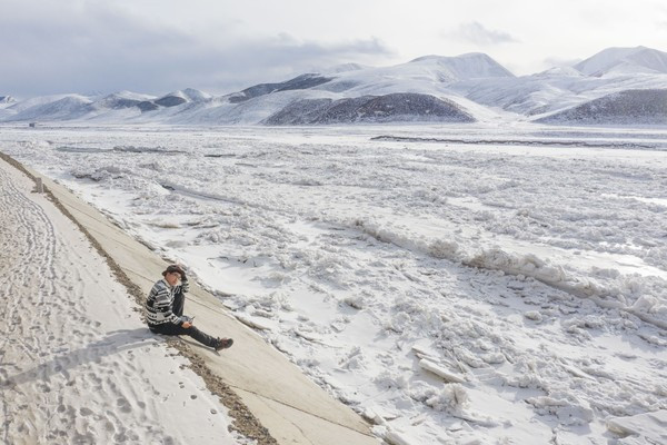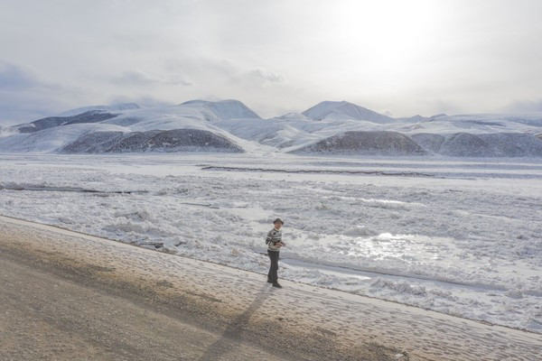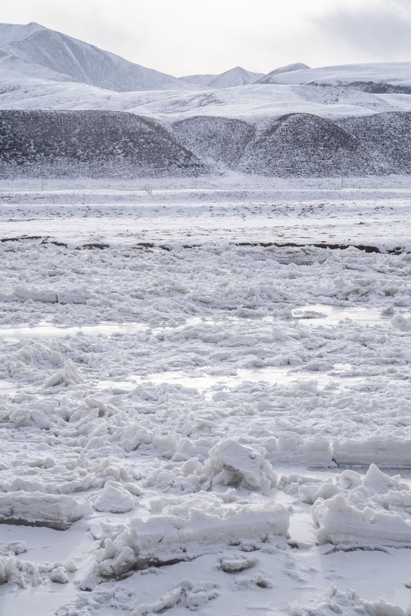 青海的冬季有太多的奇观,去祁连的路上,我们还路过了一条冰封的河流。