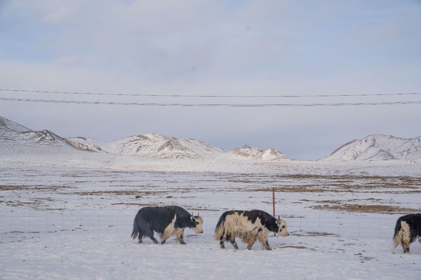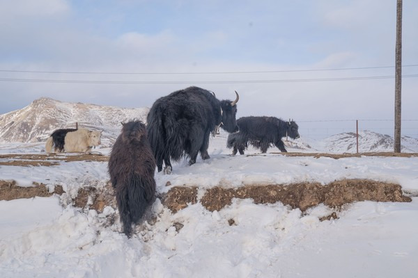 牦牛在冰雪之上行走着,就好像一只只精灵