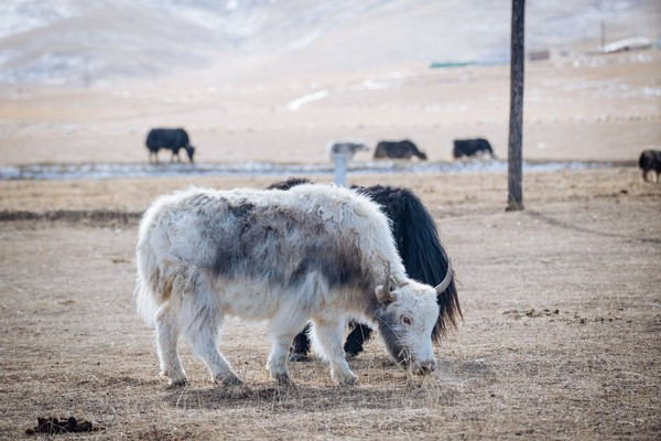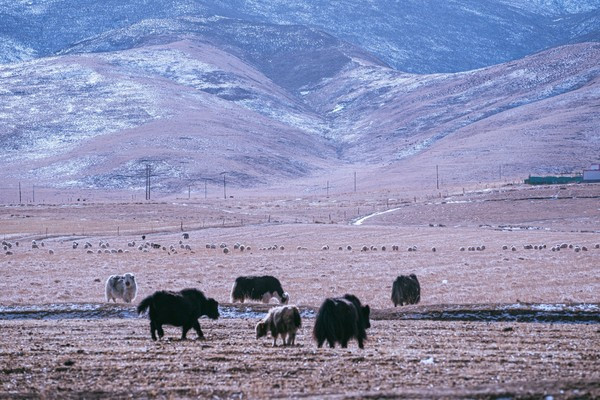 【在辽阔的雪原上,还有成群结队的牦牛】