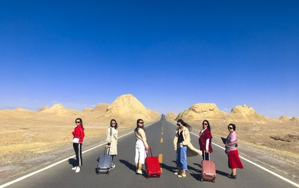 2、最美公路——趴地照、红裙照、躺地照、耍酷照、众人起跳照、拖箱照