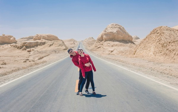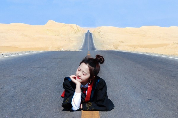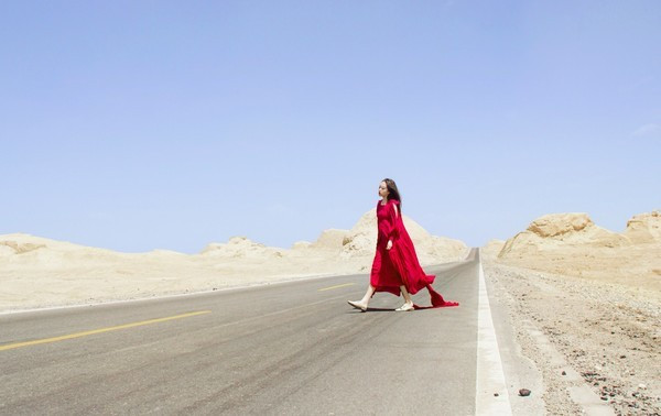 第三天:公路、戈壁、无人区,蓝色牛仔系、黑色皮夹克、红色长裙,听起来就是公路大片的既视感