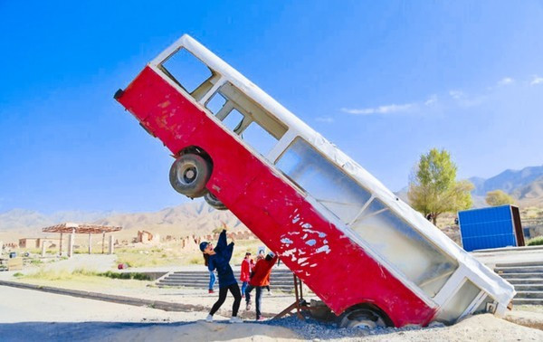 3、阿克塞石油小镇——倒插公交车照、光彩幼儿园照、站台照