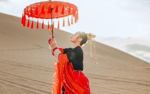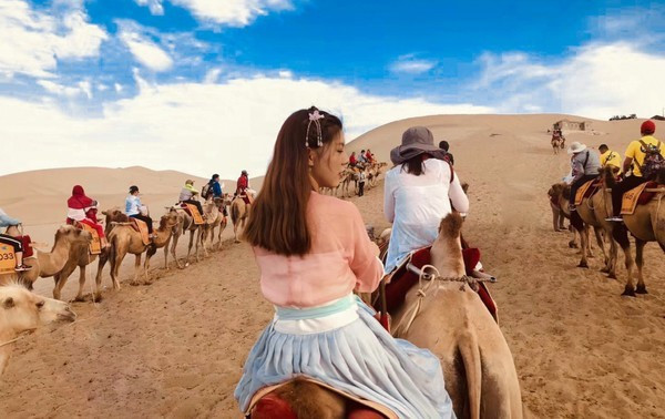 2、鸣沙山月牙泉——红裙照、白衣照、民族风群裙照、汉服照、骆驼照、剪影照