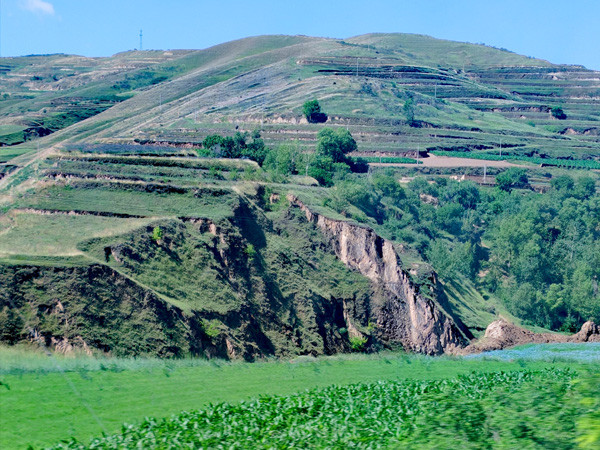 凭窗眺望一派特色鲜明的西北地域风貌,远眺是蓝天白云下环绕的高低起伏的群山,近观土黄的壕墙与高低错落房舍、麦田及茂盛的植被交相辉映……