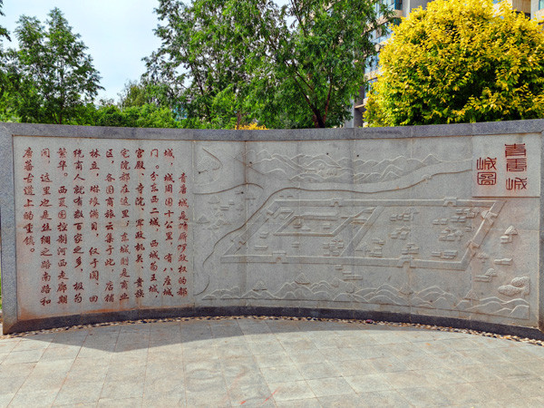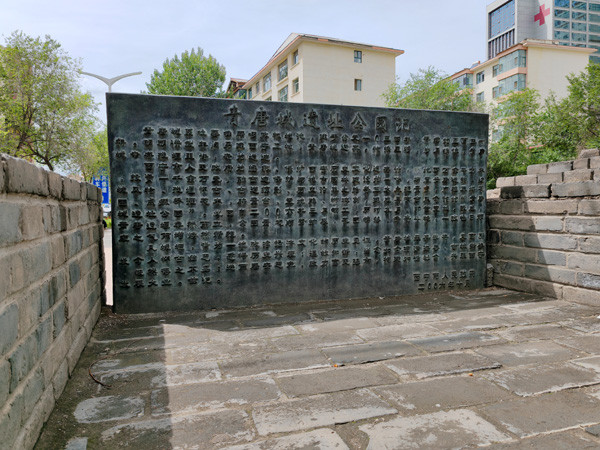 来到这座位于青海省西宁市城东区的古城遗址公园的青唐城前,只见在一段灰色砖墙的正中,一块长方形的青铜质地上书“青唐城遗址”纪念碑,赫然醒目。转到青铜碑身的后面是西宁市人民政府于2006年10月落款的《青唐城遗址公园记》。