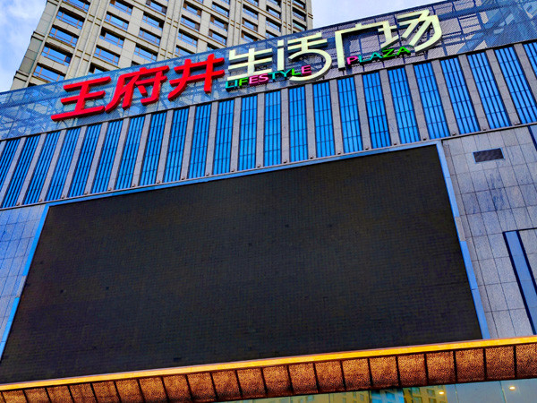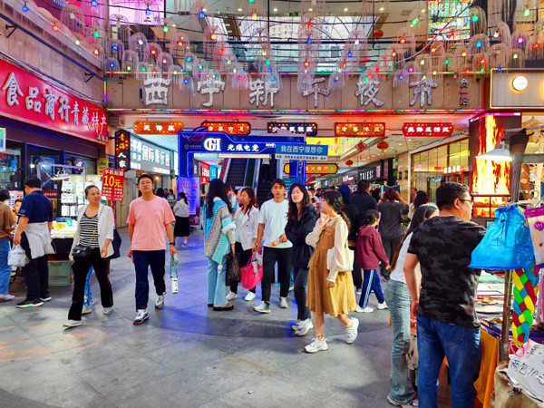 北京时间20:00,经过西宁街心花园就是著名的新千夜市。没想到在街头仰头望去,上书“王府井生活广场”的几个大字赫然醒目。原来这是一座商贸楼。顺着街口往里走就是人头攒动,灯火辉煌的新千夜市。