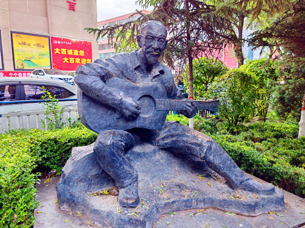 当日19:50,记者一行从入住的酒店漫步前往西宁著名的新千夜市用晚餐。途中经过街心花园,这里有一组河湟历史人物雕像,但是打头的一座却是著名音乐家王洛宾,可见其人物的分量。