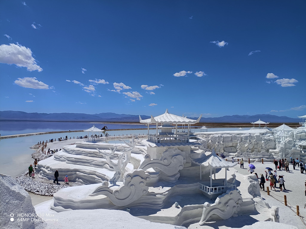 茶卡盐湖主打的是“天空之镜”和盐雕。深入盐湖,我们可以看到,盐湖底部是厚厚的石盐层,上面覆盖着一层浅浅的卤水,水域宽广,湖面如同一面巨大的镜子,将天空、云朵、山峦倒映其中,形成了一幅精美的画。这里湖面反光能力极强,在湖面和盐路上局部气温高于周边,阳光的作用非常强悍突出,每个游客的脸上都渗透着细汗。为了保护湖水不受污染,景区客服人员要求每个游客要求穿上红色的靴子才能下水,游客们无论年龄长幼,都像孩童一样涉入盐湖饱和盐水中,嘻戏玩闹,体验卤水的感觉!盐湖由盐石搭建的栈道有几公里长,栈道中间修建了小火车,火车道路一侧建了很多盐雕,穆瑶洛桑玛女神像、成吉思汗、西王母宝瓶等群雕艺术。看到盐雕展现出的艺术奇观,很多南方的游客非常兴奋,穿来穿去地拍照,仿佛已跻身天宫盛景。对于来自哈尔滨的我们,相对没有他们那么兴奋,盐雕和雪雕还是有很多相似之处,在家乡见得多了。