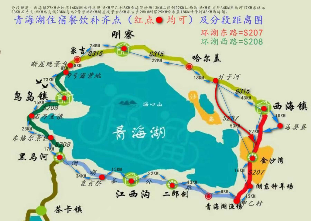西海镇-27KM-金沙湾-16KM-湖东种羊场-15KM-甲乙村-8KM-青海湖渔场-13KM-二郎剑-22KM-江西沟-15KM-直亥祭-34KM-黑马河-17KM-东格尔-23KM-石乃亥-15KM-鸟岛镇-23KM-鸟岛9号露营地-8KM-断崖观景台-8KM-泉吉乡-28KM-刚察-29KM-哈尔盖-18KM-甘子河-43KM-西海镇。以上各地均可餐饮住宿补齐。