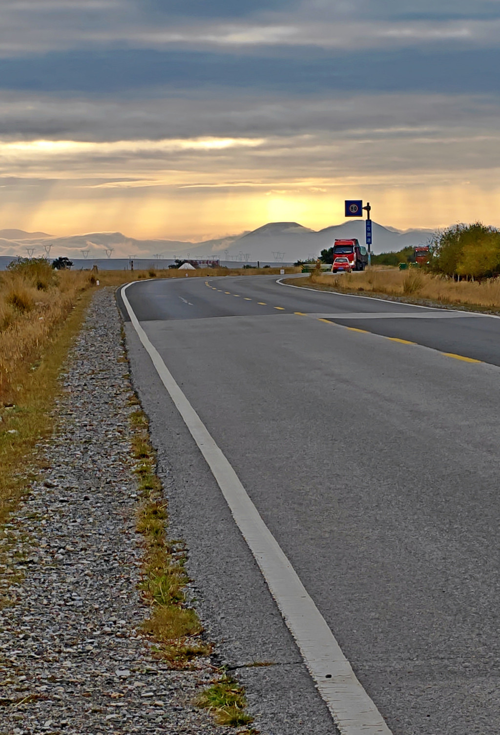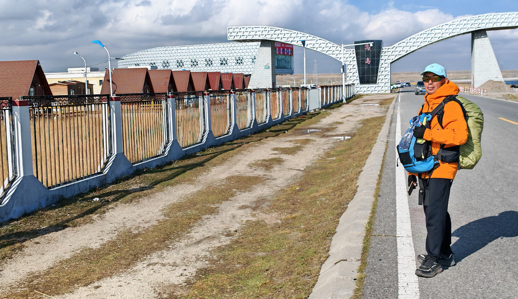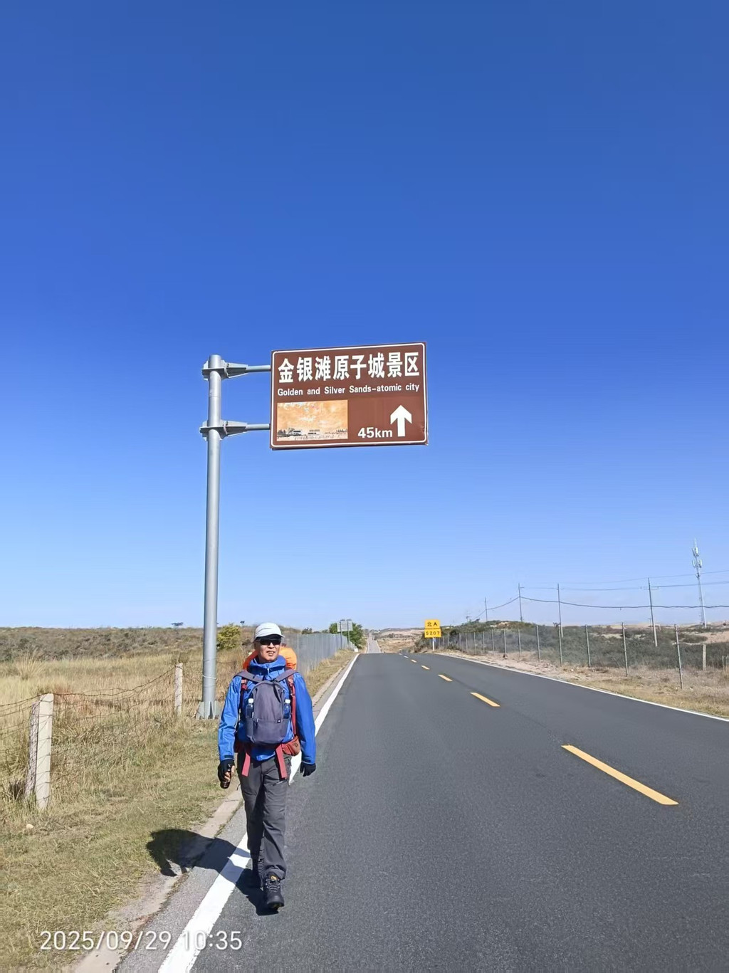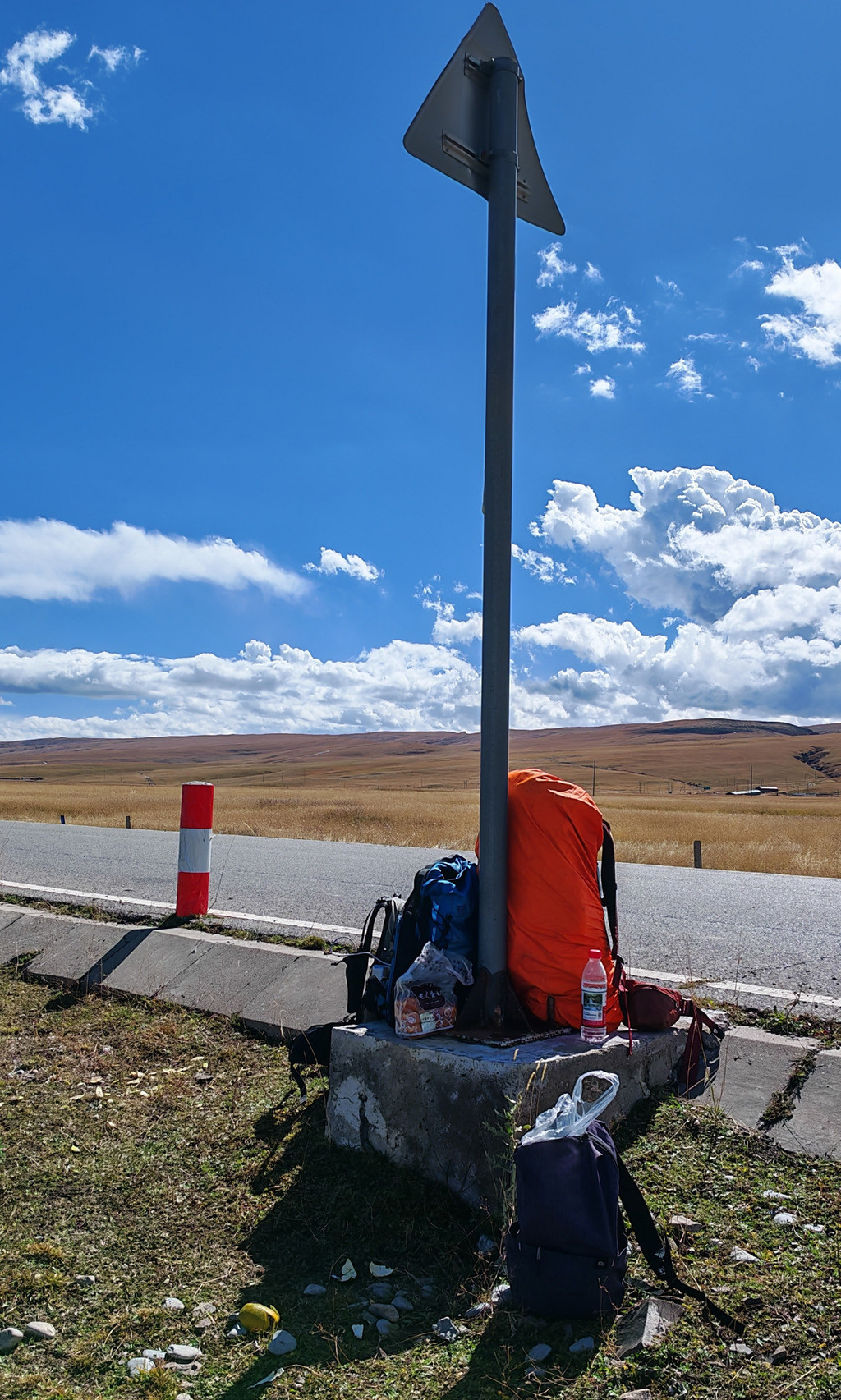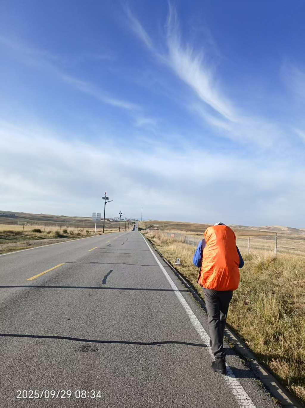 第八天(10月6):刚察-甘子河乡,全程47KM(245-292KM),用时12个半钟(6-18:30),全程走G315国道。刚察到甘子河乡途中有个哈尔盖镇(29KM处),在那里吃的午饭,期间查了一下发现甘子河竟然没有住宿地?怎么办?如果晚上走到甘子河无处可住如何是好?思前想后最后决定走到甘子河,返回哈尔盖住。找到酒店与老板商量。到甘子河接我们回来,第二天早上再把我们送回甘子河,老板挺爽快的答应了,加了40元。单程有十八九公里,挺合算的。于是我们放心走到甘子河加油站,结束当天行程,电话让酒店老板接回哈尔盖。行走途中遇到开警车的帽子叔叔,送我们两件带反光标志的绿马甲,提示我们注意安全。