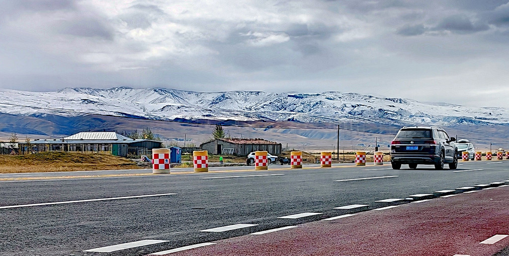 第三天(10月1):江西沟-黑马河,全程49KM(73-122KM),用时13个半钟(8-21:30),全程走倒湖茶公路。今日行程最长近50KM,我们特意早起,6点前开走,可天公不作美,下着雨了,还不小,只好在酒店等雨停或小一点,到了8点雨没停的态势,实在不能等下去了,50公里要走十三四个钟,再不走晚上十点都未必赶到黑马河,只能冒着雨,硬着头皮走。出了门我们才发现,昨天还是艳阳高照,今日周边光秃秃的山变成了白雪茫茫,下雪了!不过我们徒步途中仅是下雨并没下雪,温度零℃左右,走了两个多小时雨停了,但地是湿的,不怎么好休息,走的有点吃亏,中午在直亥祭(15KM处)附近吃的饭,晚上9点半终于到达黑马河,入住西海酒店。黑马河镇是一个比较完善的旅游集散中心,又称日之城,看日出日落好地方,黑马河是一个分叉点,右边沿倒湖茶公路可以到茶卡盐湖,左边沿环湖西路(S208)继续环湖。
