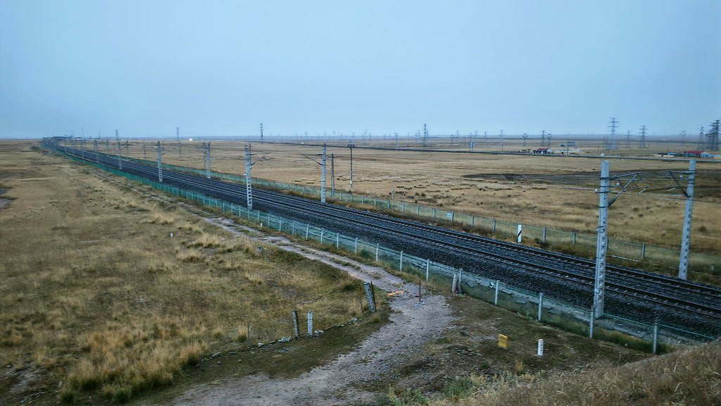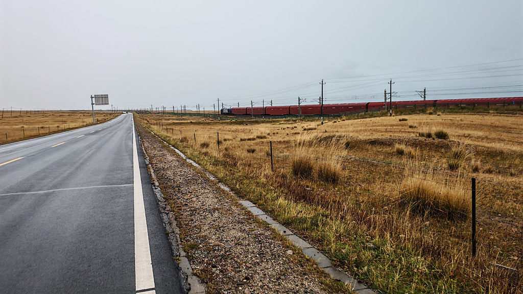 第七天(10月5):鸟岛9号露营地-刚察县,全程45KM(200-245KM),用时12个半小时(6:30-19:00),全程走G315国道。本想坐在小木屋看完日出再出发,但又是阴天下着雨,什么都看不到,只能走了,冒着小雨走约2-3小时吧。环湖西路到鸟岛9号露营地打止,1公里后进入G315道,以后全是沿着这条国道走了,大贷车贼多,司机个个猛男!开的超快,有一段路程与青藏铁路并行。从9号露营地开始基本上以上坡为主,坡度不很大,但很长,走的还是满辛苦的,19点左右到达环湖唯一的县城刚察,也是整个环湖最大的集散地,吃住行方便。途中(8KM处)是圣泉湾景区(断崖观景台),泉吉乡(16KM处)可餐饮住宿补齐。整个环湖最陡的坡就在泉吉快到刚察的途中,其实上这个陡坡时有两条路可选择,左边继续沿G315走这条大坡路,右边是一条沙土路,坡度明显小很多,但距离会长一点,至于长多少就不太清楚了,因为我们是走大坡路,估计只多个1-2公里。走沙土路的好处就是坡小,同时可以路经仙女湾景区,据说不错。