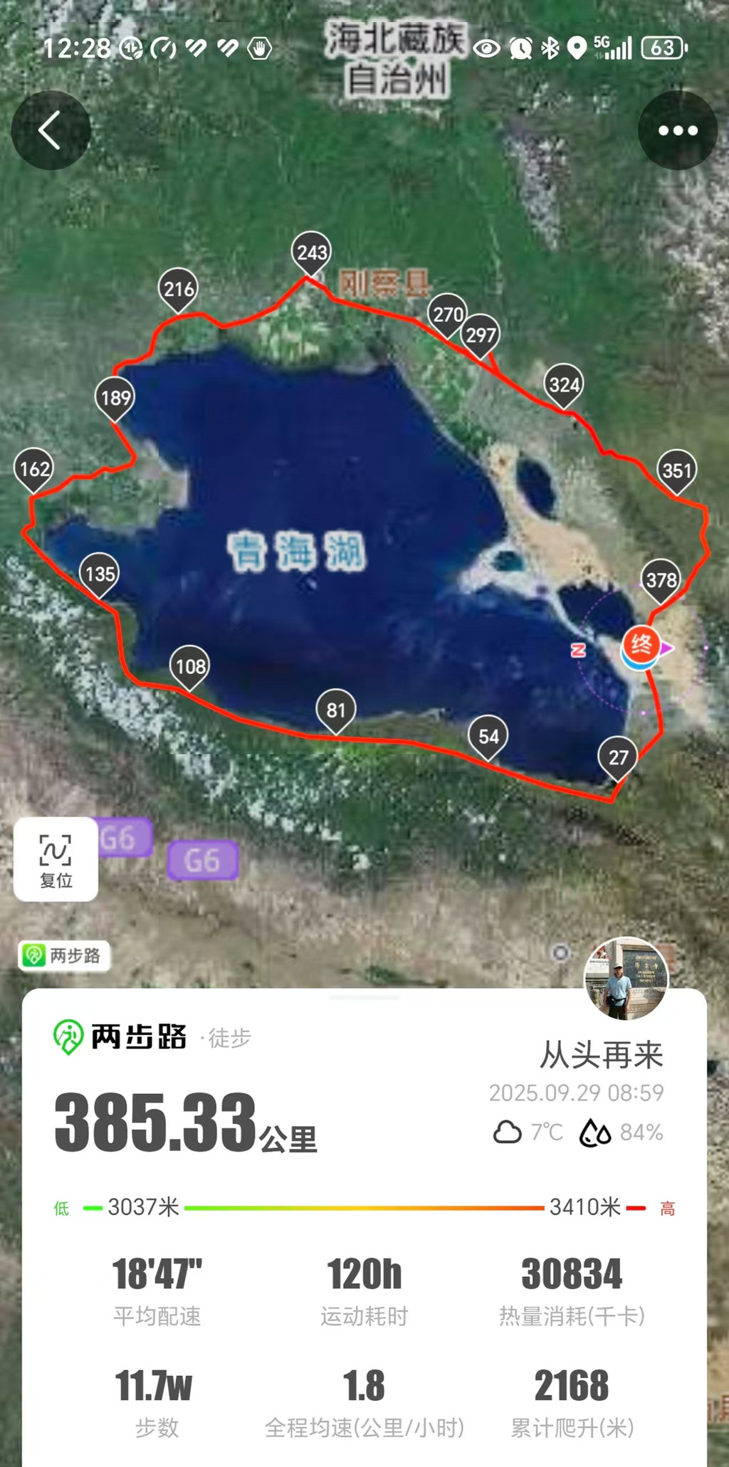 第十天(10月8):西海镇-金沙湾,全程27KM(335-362KM),用时5个半钟(6-11:30),全程走S207环湖东路。回到西海镇,环青海湖并没有形成闭环,因为我们的起点是金沙湾,西海镇离金沙湾还有27KM。故我们上午用半天时间走到金沙湾,完成了环青海湖徒步!当天我们把大背包放在酒店,轻装上阵,轻松完成。在金沙湾稍做休息,打车回到西海镇,坐下午2点半班车回到西宁,正式结束环青海湖徒步!