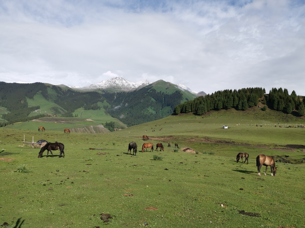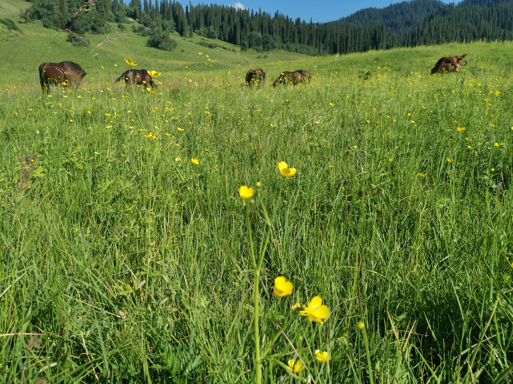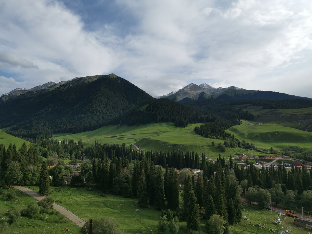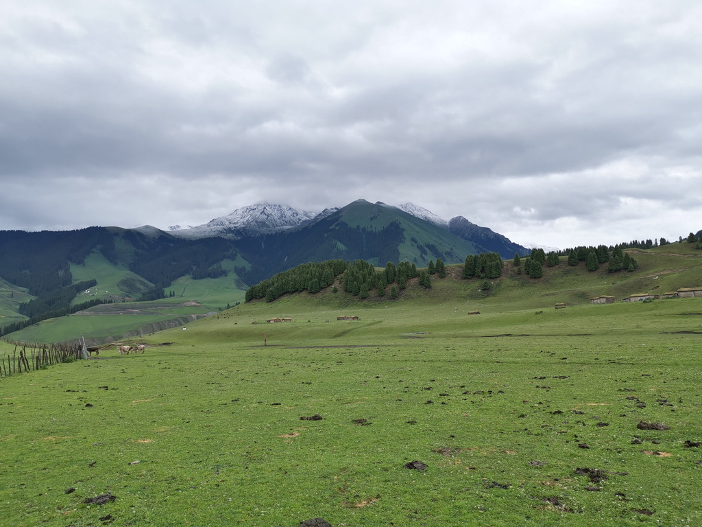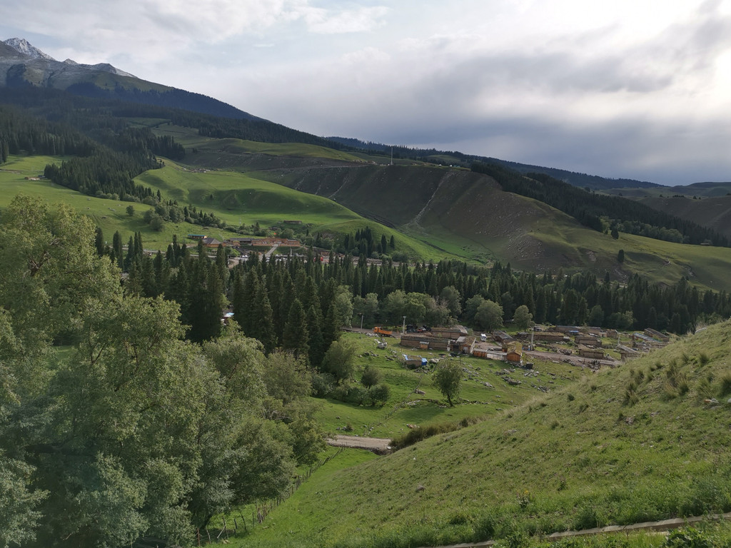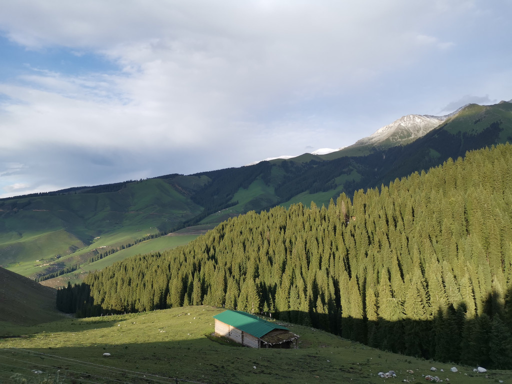 6月份的琼库什台,有着连绵起伏的山峦,稀稀疏疏的草原和树林相叠,与远处的蓝天白云组合在一起,便行成一处处美景。天蓝,云白,银装素裹的雪山,如织的墨绿色森林,淡青色的草原,和在五颜六色花海上的小木屋。当然,沿途的风景也是不容错过的,村内几乎所有的民房都是木建筑,其中有几处已经是超过100年的久居,意义非凡。走在村落里,看见牛儿在树下低头吃草,悠悠闲闲,所谓的解甲归田,也不过就景色。远方的彷佛听见轻轻的牛的鸣叫,这样的场景只应天上有,人间相拥太奢侈。在这里已经不再用去叙述空气的清新,就连树木都比城市里的更有灵气。这里是远离世俗的世外桃源,琼库什台,这里值得,非常值得!因为藏在深山里,不被世人所熟知,没有什么人流,也就没有嘈杂。每一个小木屋,都有它的美好小故事,神秘又梦幻。琼库什台的居民,绝大多数都是哈萨克族,他们淳朴善良,小朋友们也都能歌善舞。当炊烟袅袅,被唤醒清晨的琼库什台,在无边草原,原始森林和雪山的映衬下,整个村子原始宁静,彷佛置身于童话世界。