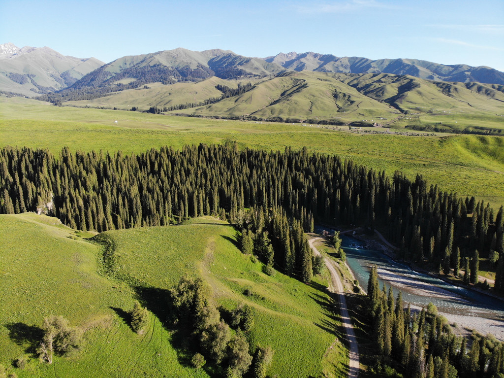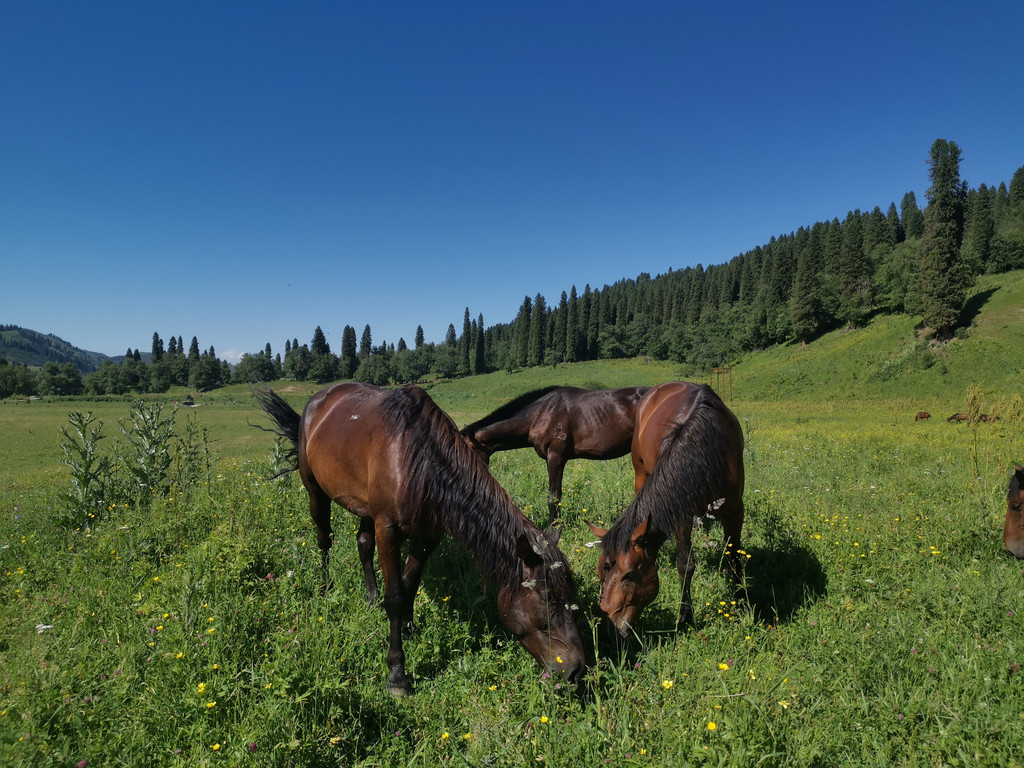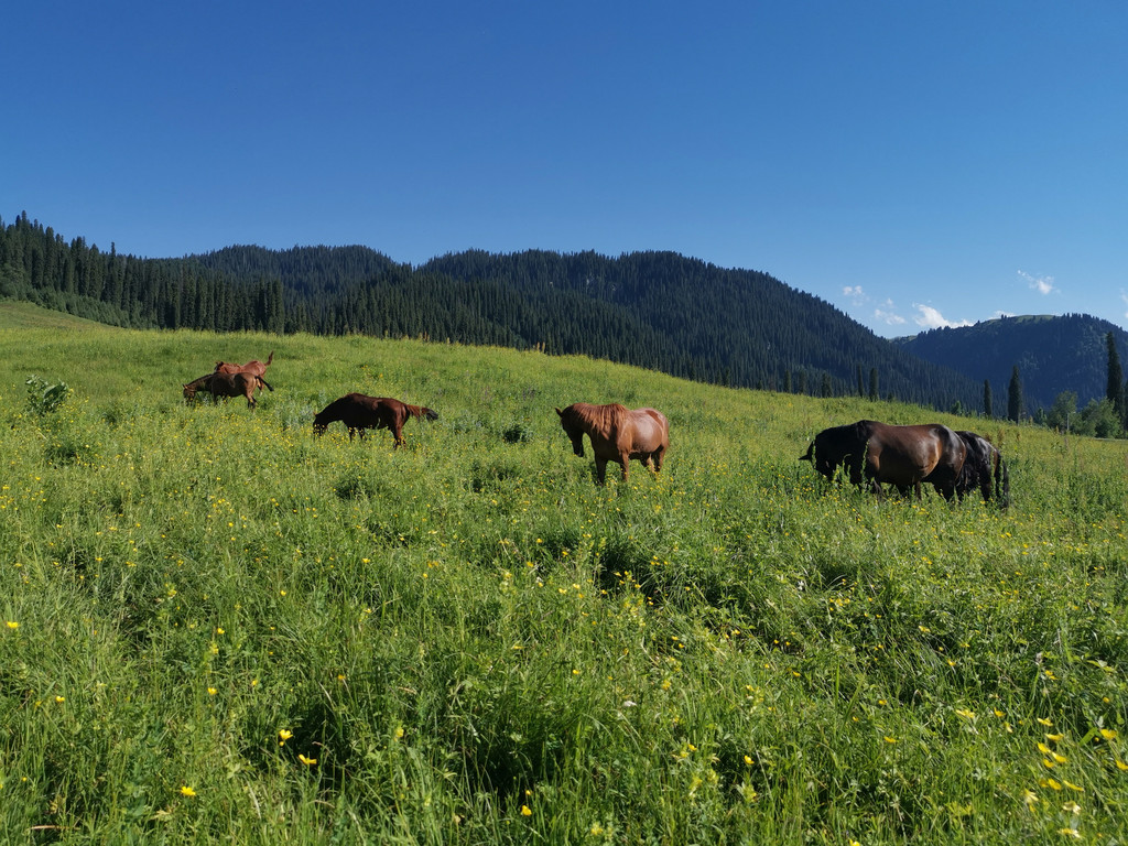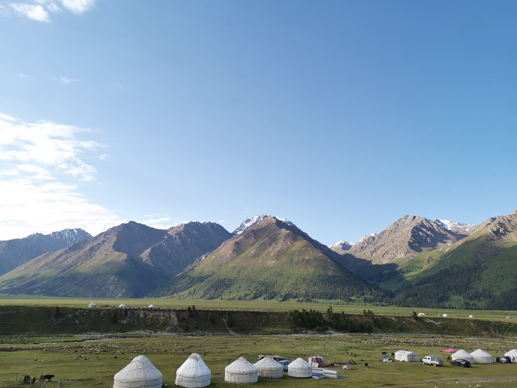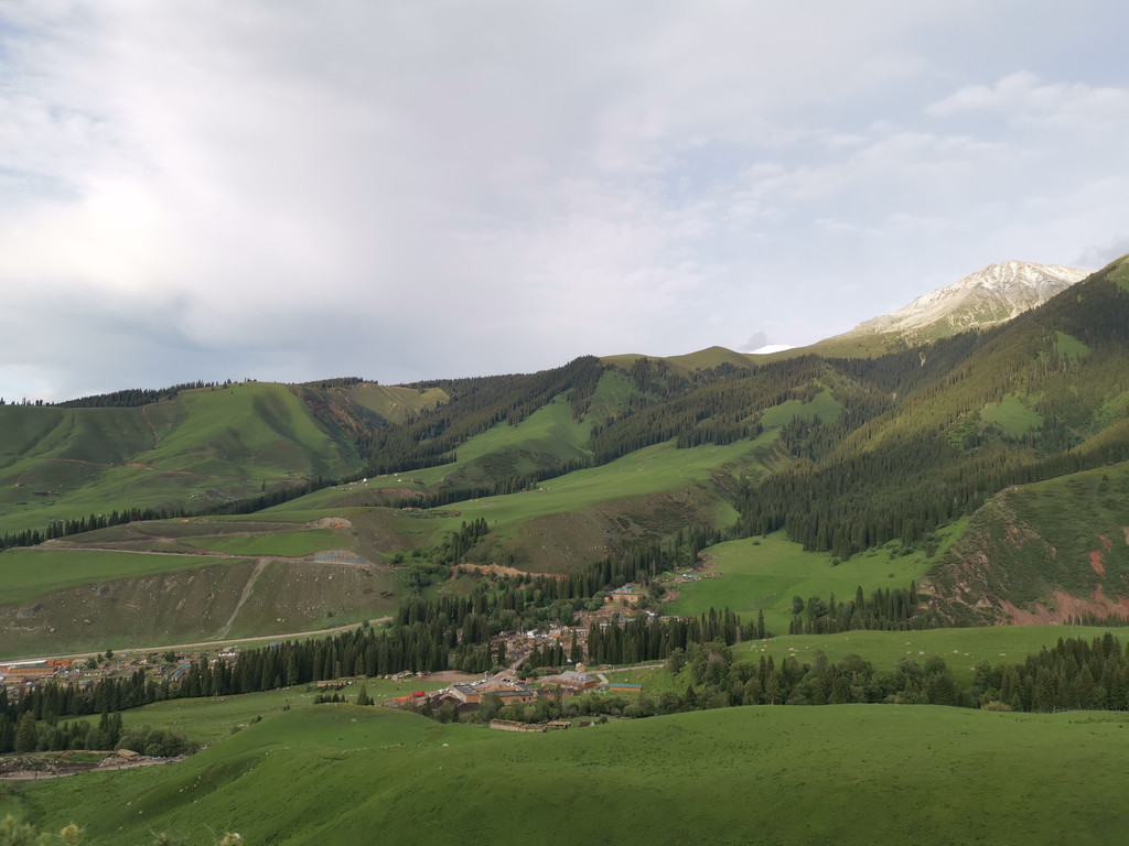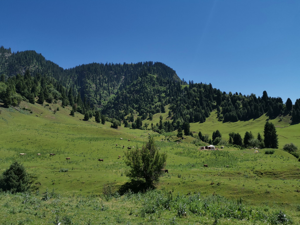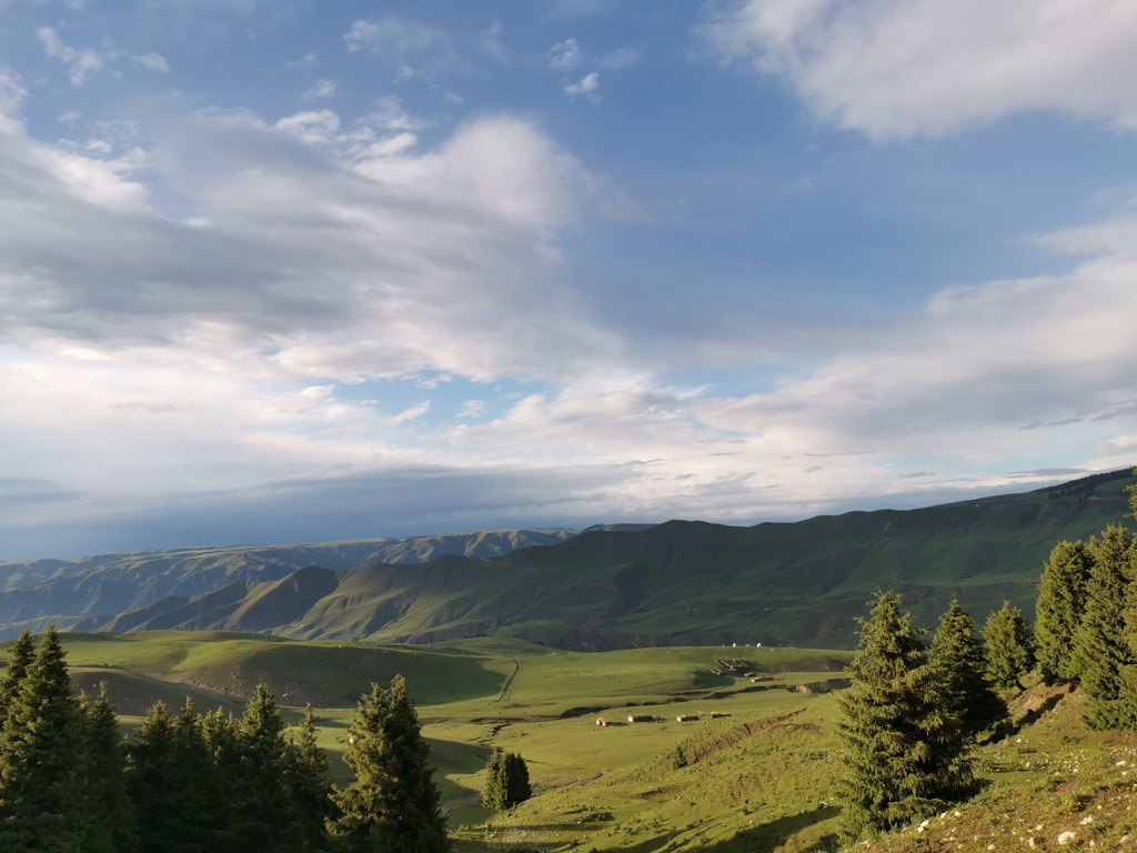 6月份的琼库什台,有着连绵起伏的山峦,稀稀疏疏的草原和树林相叠,与远处的蓝天白云组合在一起,便行成一处处美景。天蓝,云白,银装素裹的雪山,如织的墨绿色森林,淡青色的草原,和在五颜六色花海上的小木屋。当然,沿途的风景也是不容错过的,村内几乎所有的民房都是木建筑,其中有几处已经是超过100年的久居,意义非凡。走在村落里,看见牛儿在树下低头吃草,悠悠闲闲,所谓的解甲归田,也不过就景色。远方的彷佛听见轻轻的牛的鸣叫,这样的场景只应天上有,人间相拥太奢侈。在这里已经不再用去叙述空气的清新,就连树木都比城市里的更有灵气。这里是远离世俗的世外桃源,琼库什台,这里值得,非常值得!因为藏在深山里,不被世人所熟知,没有什么人流,也就没有嘈杂。每一个小木屋,都有它的美好小故事,神秘又梦幻。琼库什台的居民,绝大多数都是哈萨克族,他们淳朴善良,小朋友们也都能歌善舞。当炊烟袅袅,被唤醒清晨的琼库什台,在无边草原,原始森林和雪山的映衬下,整个村子原始宁静,彷佛置身于童话世界。