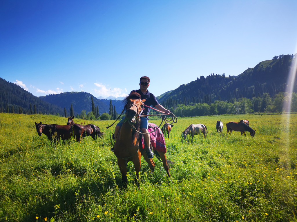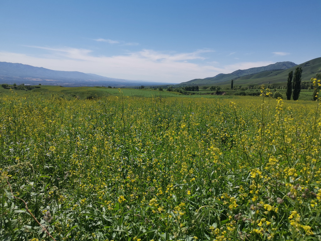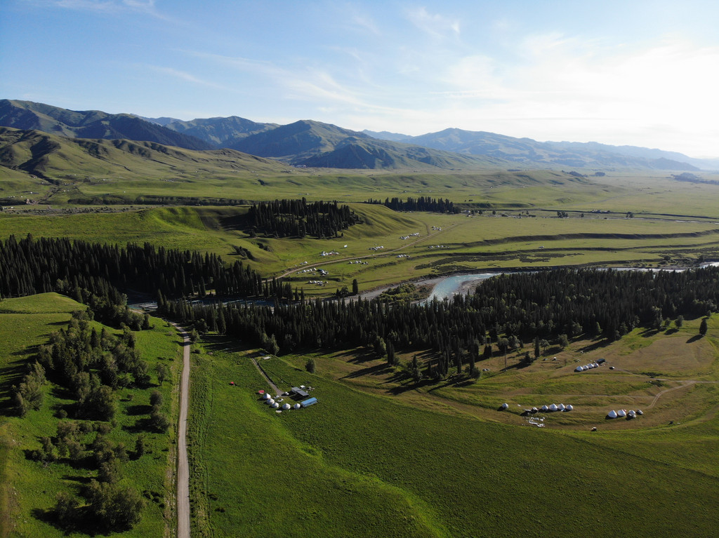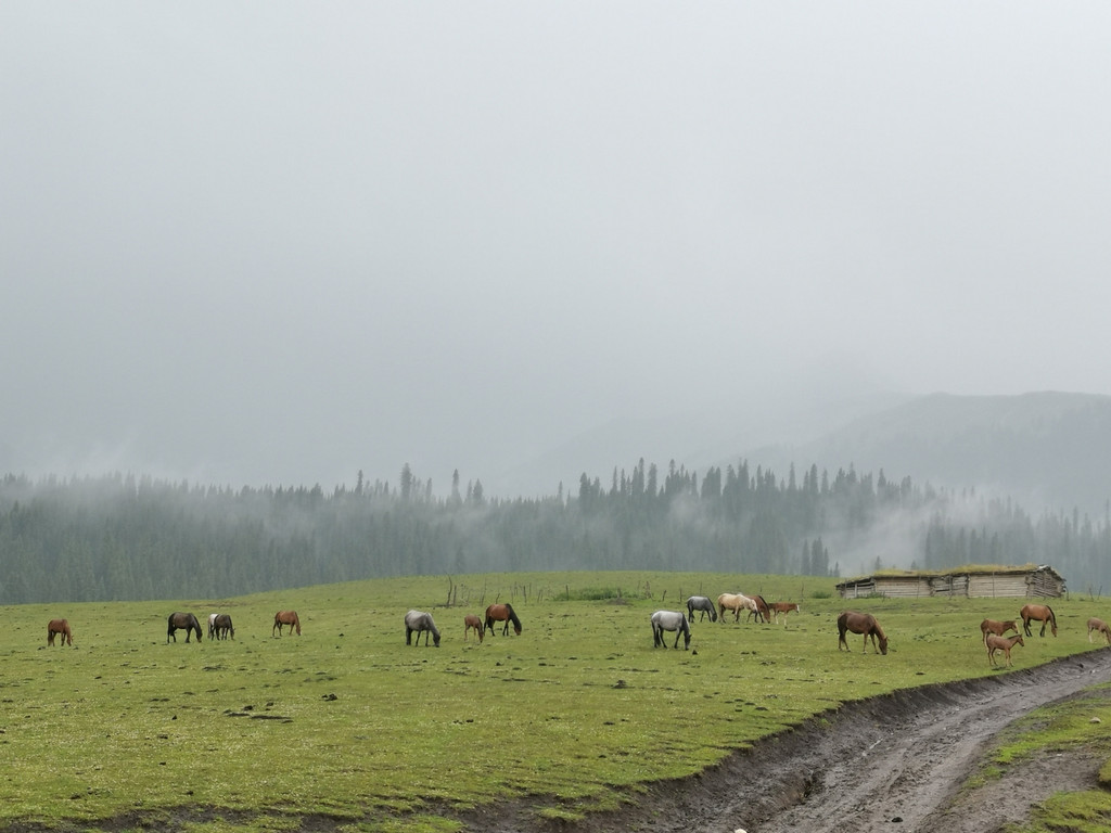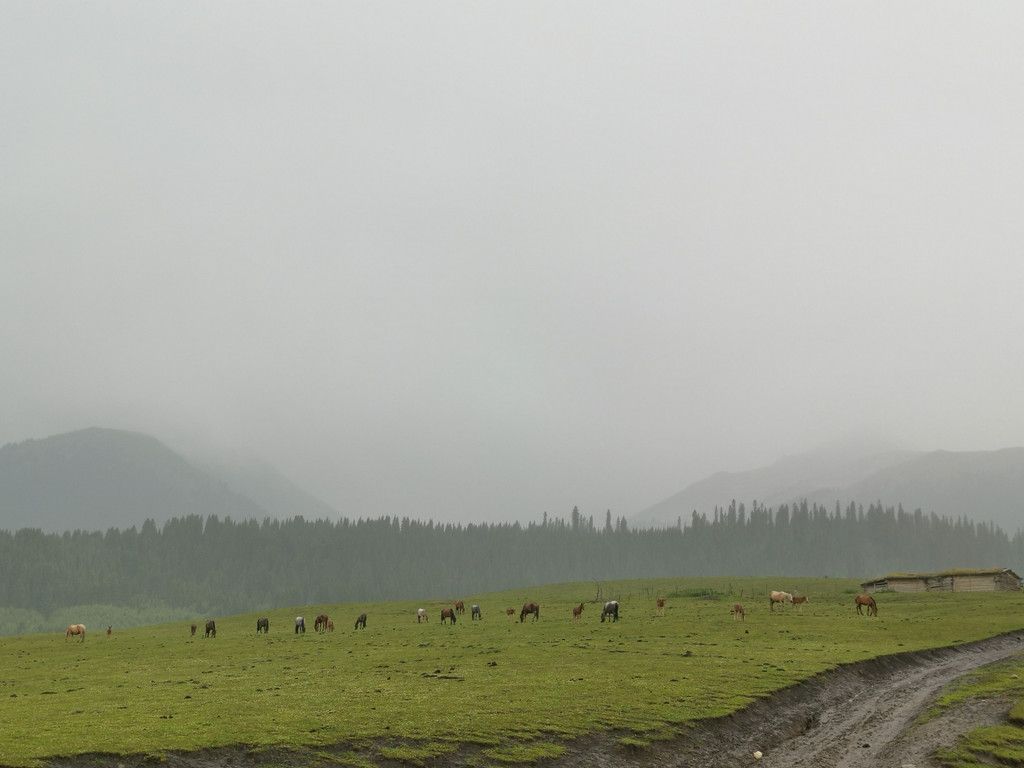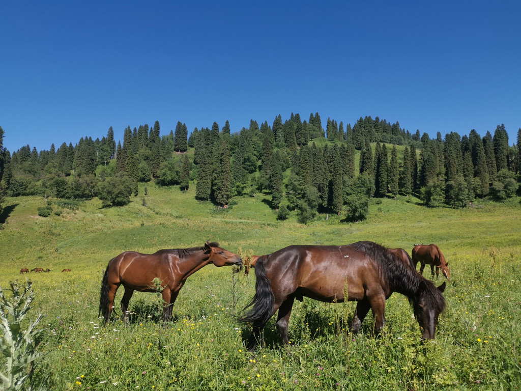 6月份的琼库什台,有着连绵起伏的山峦,稀稀疏疏的草原和树林相叠,与远处的蓝天白云组合在一起,便行成一处处美景。天蓝,云白,银装素裹的雪山,如织的墨绿色森林,淡青色的草原,和在五颜六色花海上的小木屋。当然,沿途的风景也是不容错过的,村内几乎所有的民房都是木建筑,其中有几处已经是超过100年的久居,意义非凡。走在村落里,看见牛儿在树下低头吃草,悠悠闲闲,所谓的解甲归田,也不过就景色。远方的彷佛听见轻轻的牛的鸣叫,这样的场景只应天上有,人间相拥太奢侈。在这里已经不再用去叙述空气的清新,就连树木都比城市里的更有灵气。这里是远离世俗的世外桃源,琼库什台,这里值得,非常值得!因为藏在深山里,不被世人所熟知,没有什么人流,也就没有嘈杂。每一个小木屋,都有它的美好小故事,神秘又梦幻。琼库什台的居民,绝大多数都是哈萨克族,他们淳朴善良,小朋友们也都能歌善舞。当炊烟袅袅,被唤醒清晨的琼库什台,在无边草原,原始森林和雪山的映衬下,整个村子原始宁静,彷佛置身于童话世界。