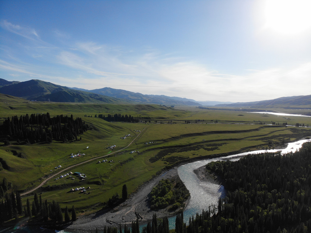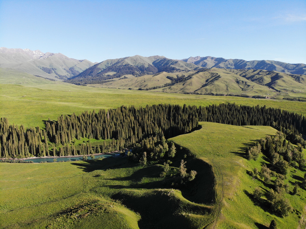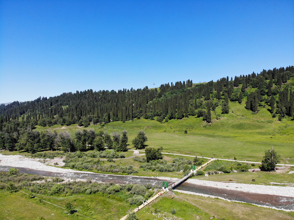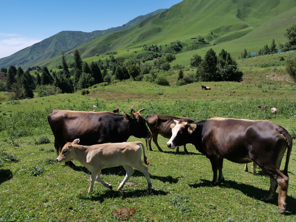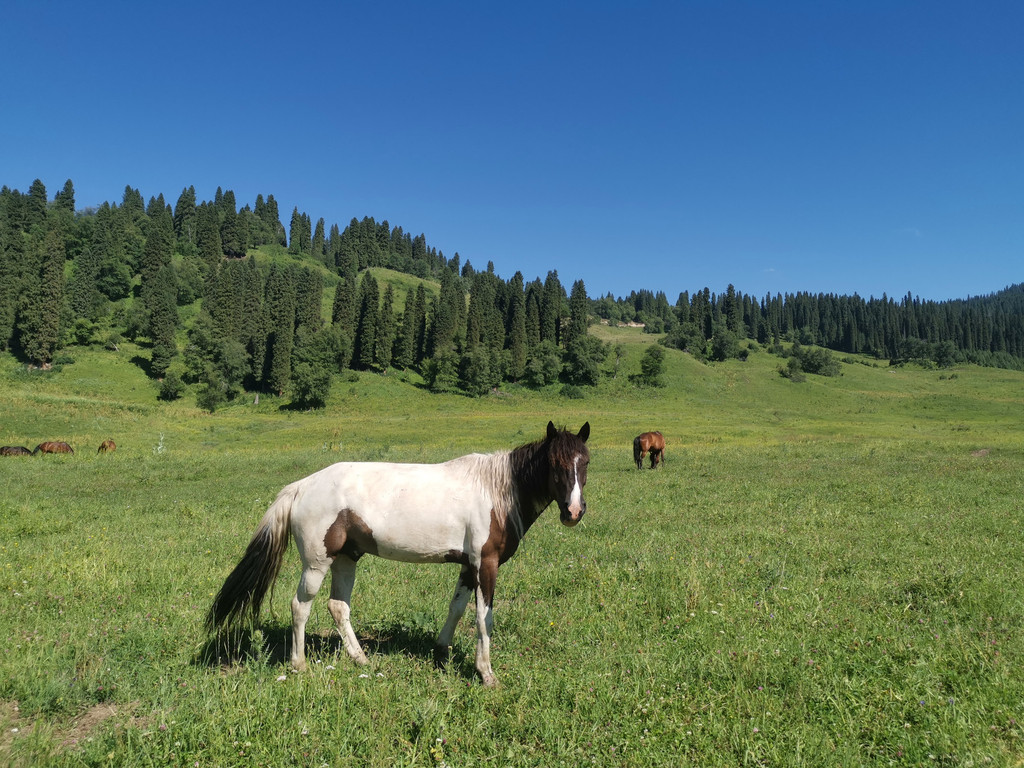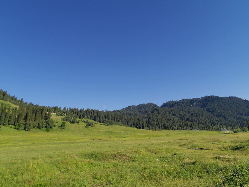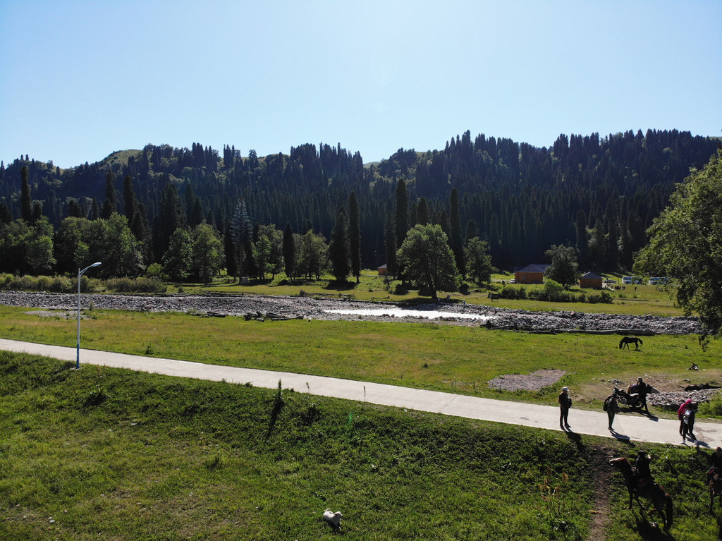 6月份的琼库什台,有着连绵起伏的山峦,稀稀疏疏的草原和树林相叠,与远处的蓝天白云组合在一起,便行成一处处美景。天蓝,云白,银装素裹的雪山,如织的墨绿色森林,淡青色的草原,和在五颜六色花海上的小木屋。当然,沿途的风景也是不容错过的,村内几乎所有的民房都是木建筑,其中有几处已经是超过100年的久居,意义非凡。走在村落里,看见牛儿在树下低头吃草,悠悠闲闲,所谓的解甲归田,也不过就景色。远方的彷佛听见轻轻的牛的鸣叫,这样的场景只应天上有,人间相拥太奢侈。在这里已经不再用去叙述空气的清新,就连树木都比城市里的更有灵气。这里是远离世俗的世外桃源,琼库什台,这里值得,非常值得!因为藏在深山里,不被世人所熟知,没有什么人流,也就没有嘈杂。每一个小木屋,都有它的美好小故事,神秘又梦幻。琼库什台的居民,绝大多数都是哈萨克族,他们淳朴善良,小朋友们也都能歌善舞。当炊烟袅袅,被唤醒清晨的琼库什台,在无边草原,原始森林和雪山的映衬下,整个村子原始宁静,彷佛置身于童话世界。