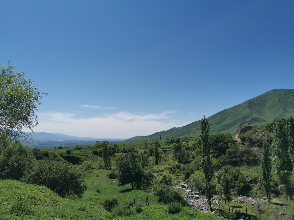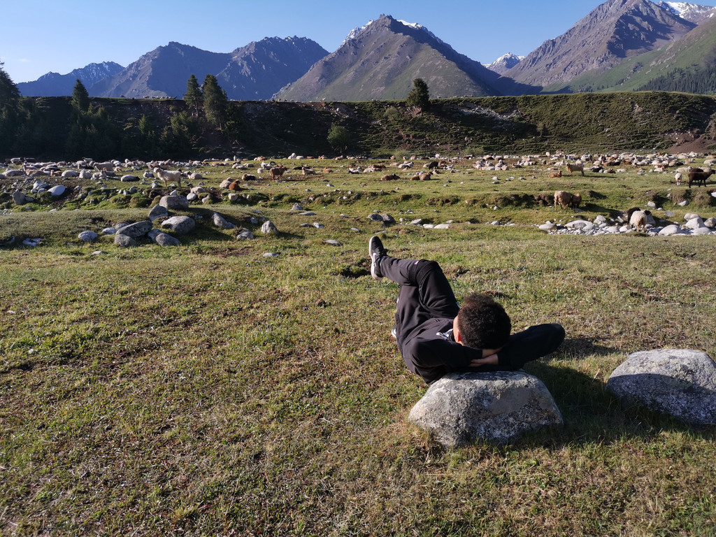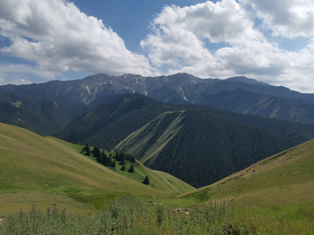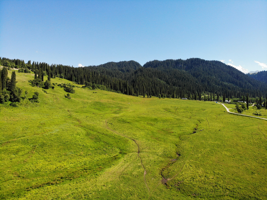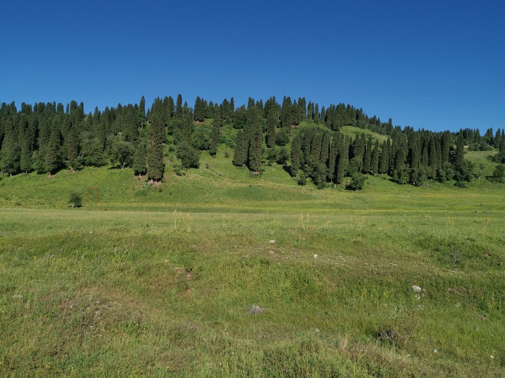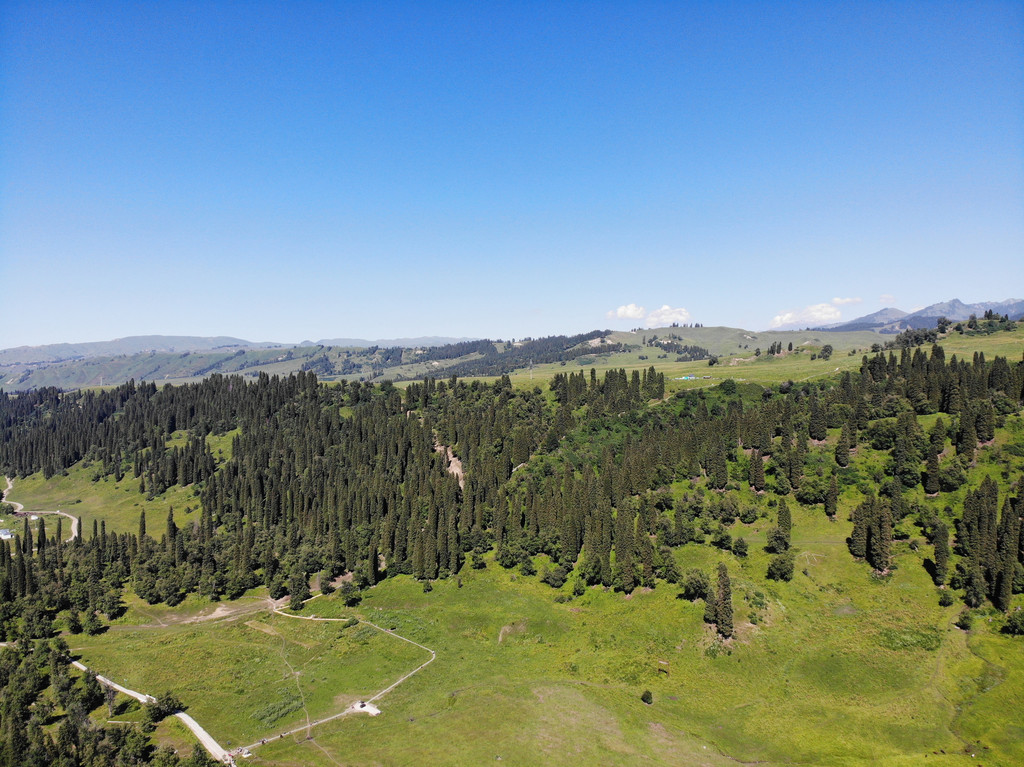 6月份的琼库什台,有着连绵起伏的山峦,稀稀疏疏的草原和树林相叠,与远处的蓝天白云组合在一起,便行成一处处美景。天蓝,云白,银装素裹的雪山,如织的墨绿色森林,淡青色的草原,和在五颜六色花海上的小木屋。当然,沿途的风景也是不容错过的,村内几乎所有的民房都是木建筑,其中有几处已经是超过100年的久居,意义非凡。走在村落里,看见牛儿在树下低头吃草,悠悠闲闲,所谓的解甲归田,也不过就景色。远方的彷佛听见轻轻的牛的鸣叫,这样的场景只应天上有,人间相拥太奢侈。在这里已经不再用去叙述空气的清新,就连树木都比城市里的更有灵气。这里是远离世俗的世外桃源,琼库什台,这里值得,非常值得!因为藏在深山里,不被世人所熟知,没有什么人流,也就没有嘈杂。每一个小木屋,都有它的美好小故事,神秘又梦幻。琼库什台的居民,绝大多数都是哈萨克族,他们淳朴善良,小朋友们也都能歌善舞。当炊烟袅袅,被唤醒清晨的琼库什台,在无边草原,原始森林和雪山的映衬下,整个村子原始宁静,彷佛置身于童话世界。