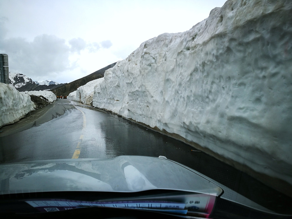 翻越冰大坂,路边的积雪有几米高,这是铲雪车推出来的通道,要等到积雪自然融化达到通行条件恐怕七月才能过车。