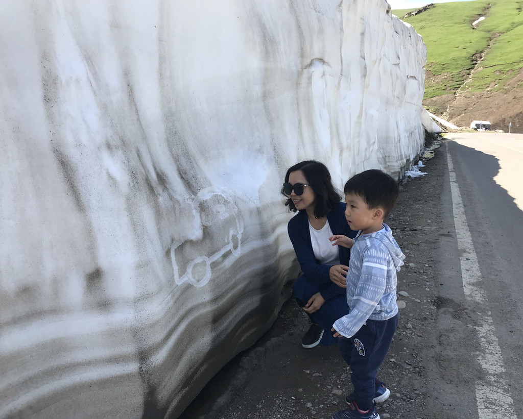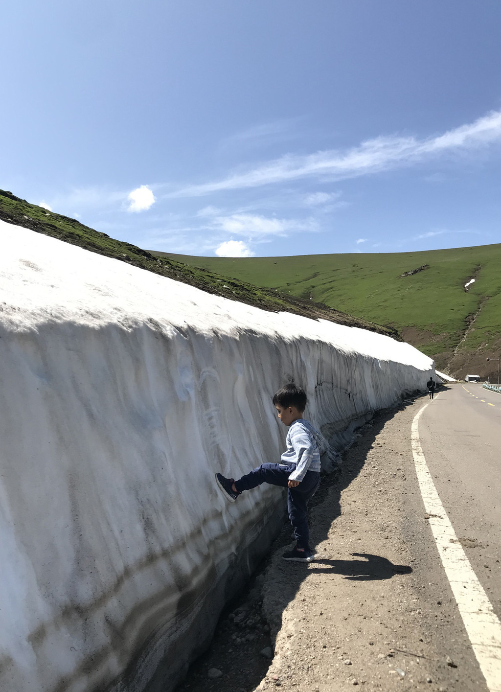 这是个被上帝“封印”的地方。瞧路边堆积如山的雪堆,今天是6月9日,应该是渐入盛夏的时节,这里却一点也没有夏日的气息,在天山,一山有四季,果然名不虚传。