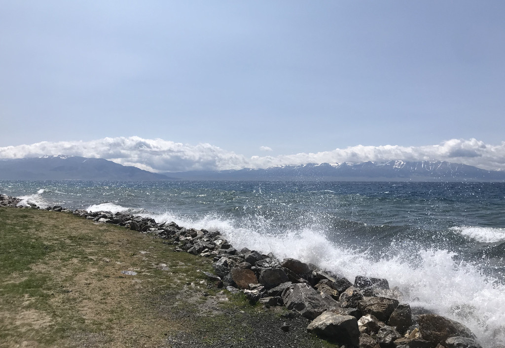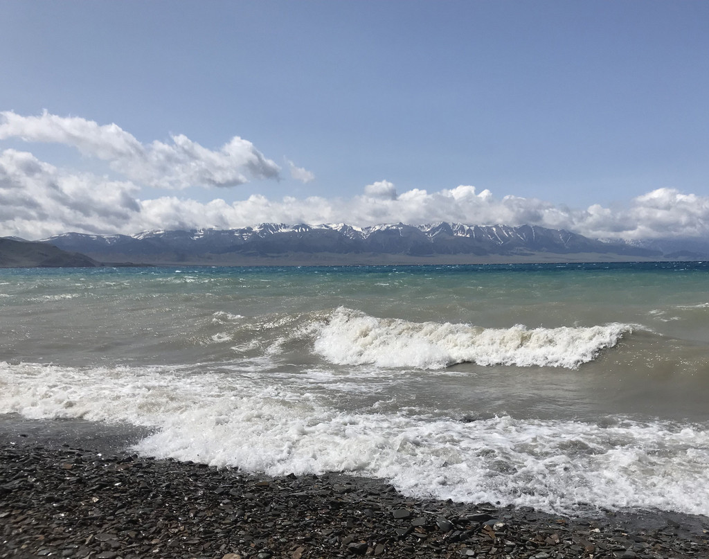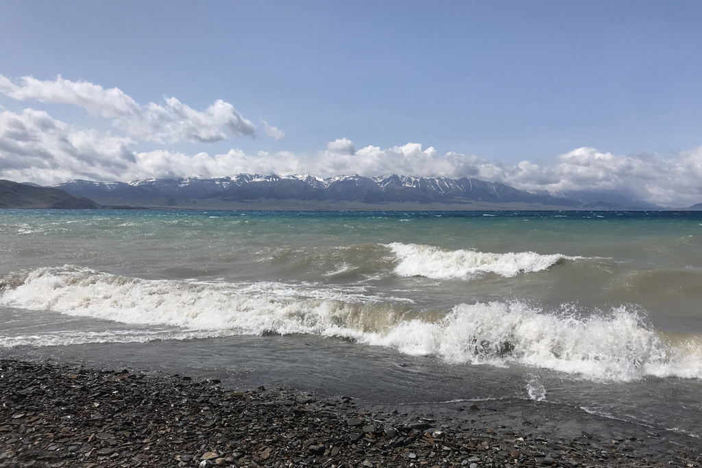 在风的蛊惑下,湖水竭尽全力把自己翻腾成大海的扮相,看,那巨浪滔天!听,那震耳欲聋!哪点不是海边的感觉?看来赛里木湖不是个老戏骨,也是个老戏精!哈哈!
