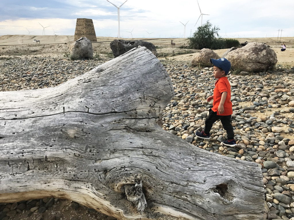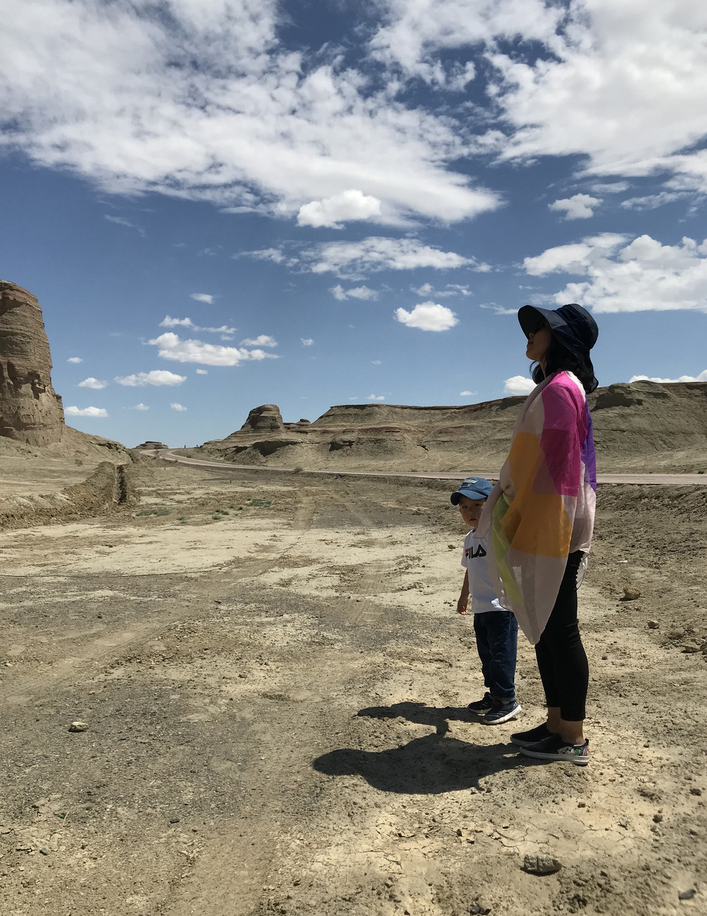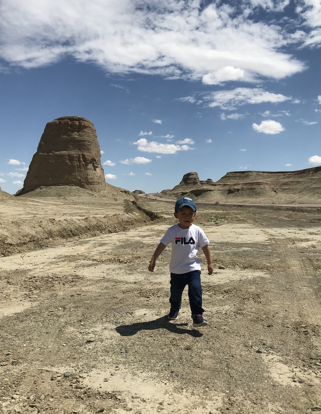 祺小宝躲在妈妈身后,再好动的精灵也抵不过这炙热的天气,魔鬼城,名副其实。