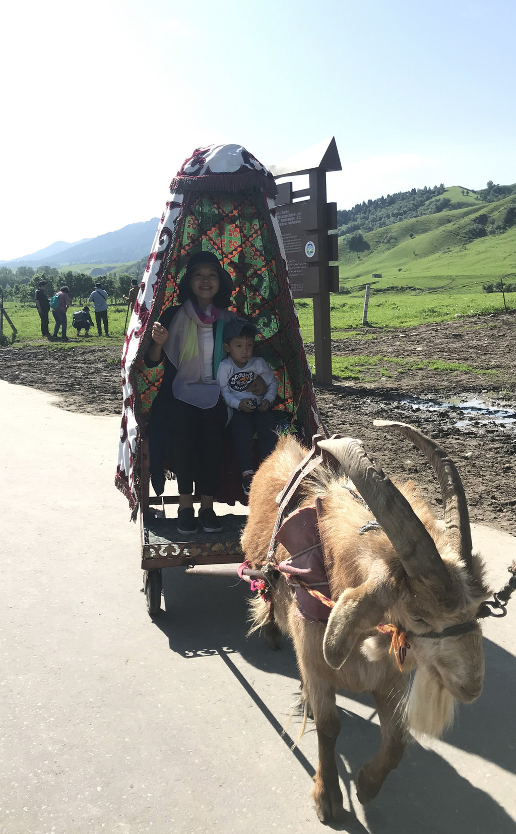 那拉提草原位于伊犁州新源县境内,哈萨克斯坦语为白阳坡,是世界四大草原之一的亚山草甸植物区,这里的草原属于高山草原,那拉提草原地区是中国哈萨克族人口居住最集中的地区。刚一进草原,祺小宝就被公山羊拉的蓬车吸引了,为安全起见,只好由祺妈陪同,瞧山羊那不乐意的样子,给点面子,没瞧见我们祺小宝也很紧张吗?