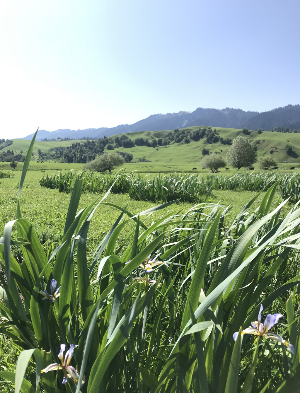 那拉提草原,感觉狭长而精致,这里的草嫩绿柔软,天山山脉独特的地理形成的小气候,让这里呈现出与新疆其他地区不同的温湿环境,这些不知道名字的花儿,紫罗兰的花瓣和淡鹅黄的花芯,点缀着嫩绿的草原,显得清新雅致。