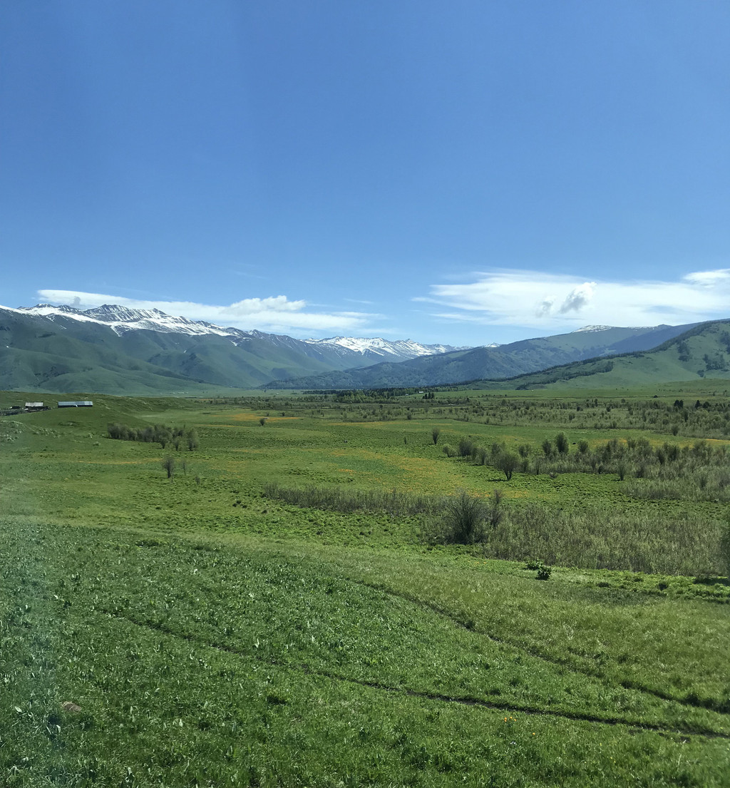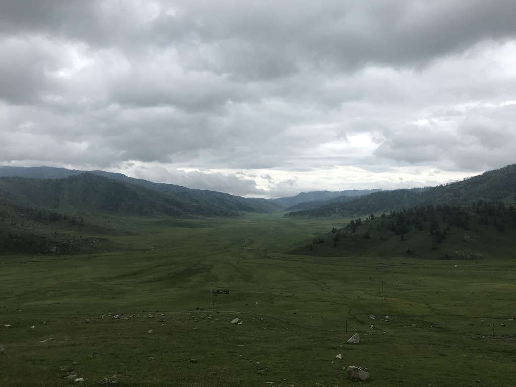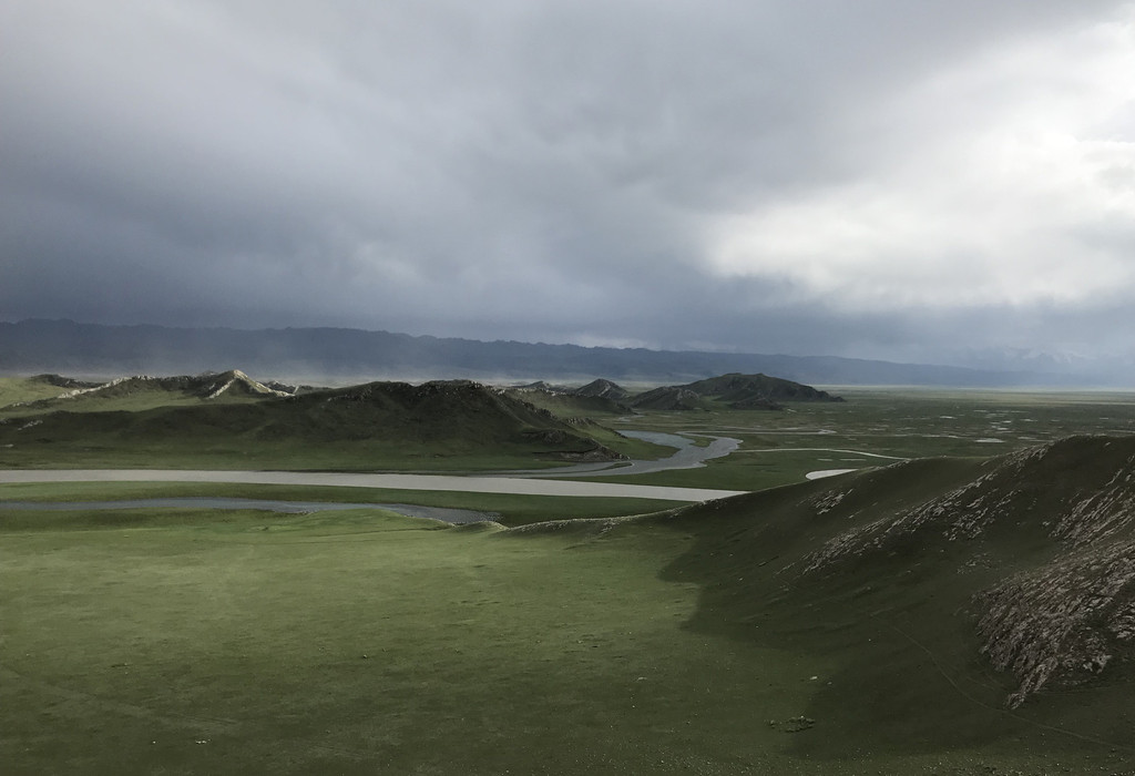 过了盆地也就走出了漫漫戈壁,转过弯来,忽然出现一片连绵的草甸,远山郁郁葱葱,仿佛电影的转场,美景来得突然,很有点猝不及防!