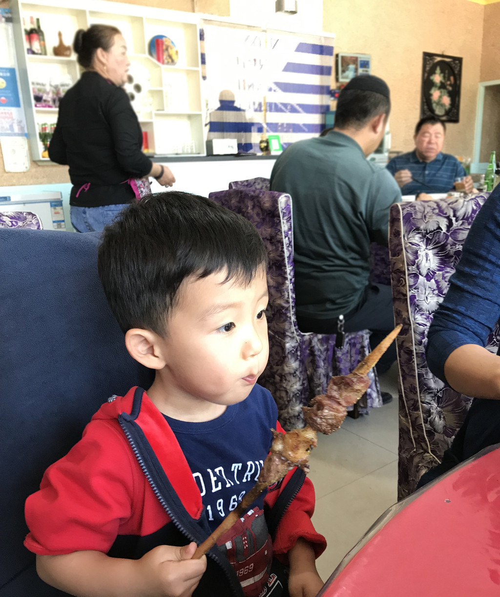 中午,一顿烤肉伺候,祺小宝也忍不住要尝尝这人间美味,新鲜红柳枝穿的那拉提草原的新鲜羊肉串,肉质鲜嫩,是回北京找不到的味道,祺小宝人生的第一串大肉串就此产生。