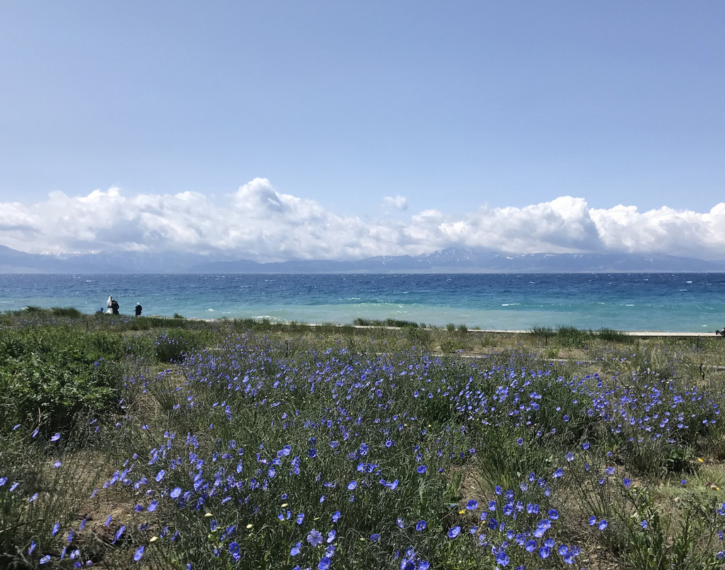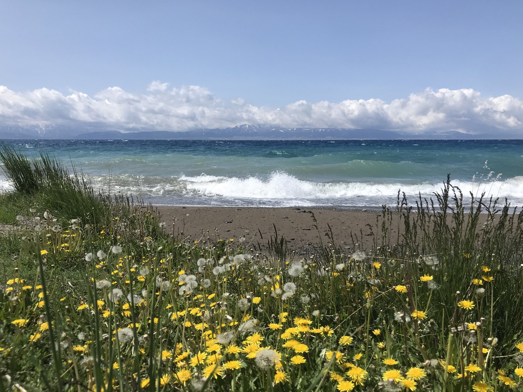 在蓝色的花海的色差之下,湖水显得更蓝,如果风平浪静,不知道多美。。或许是赛里木湖不希望我们轻视她,因此耍起了脾气,知道了,赛里美!下次我专程来会你,赛里木湖,难得一见,更值得一见。。