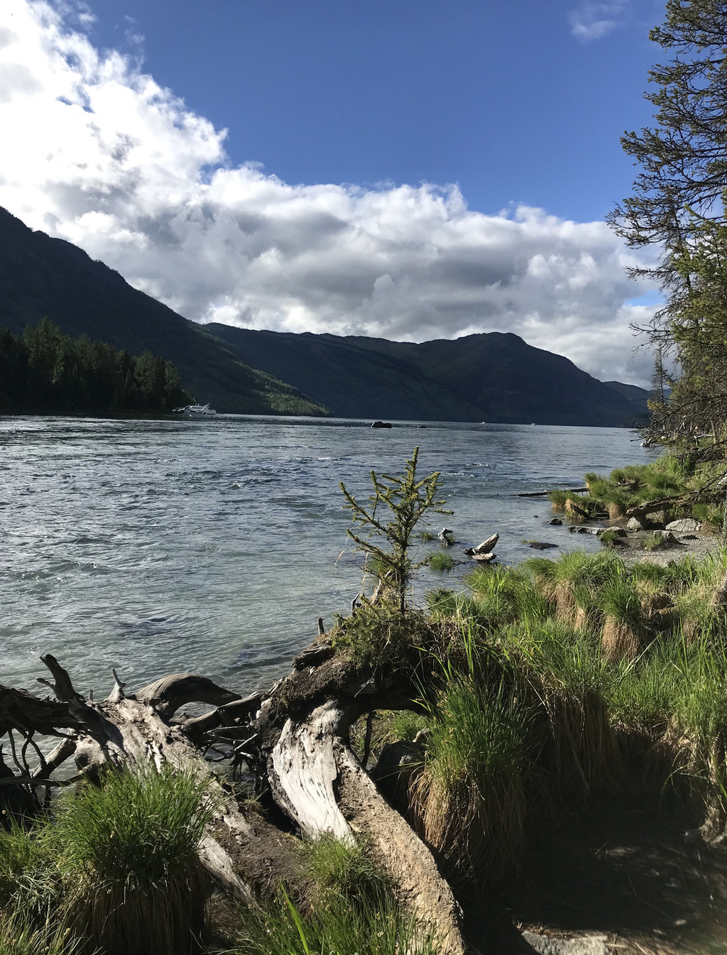 喀纳斯湖是个狭长的湖,漫步岸边时有一种河流的错觉,两岸群山环绕,湖水深藏于深山峡谷之中,神秘而静谧,岸边奇木丛生,水中不时出现造型奇特的物体,看不清是石头还是木头,难怪这里流传着水怪的传说,不经意间,很容易被湖水中若隐若现的那些怪石吓上一跳。