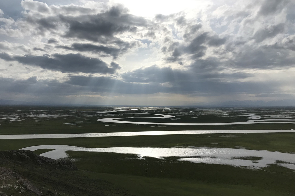 巴音布鲁克草原的通天河九曲十八弯奇观,阳光漏出云层,撒在九曲河上,长河弯弯,荡气回肠。。