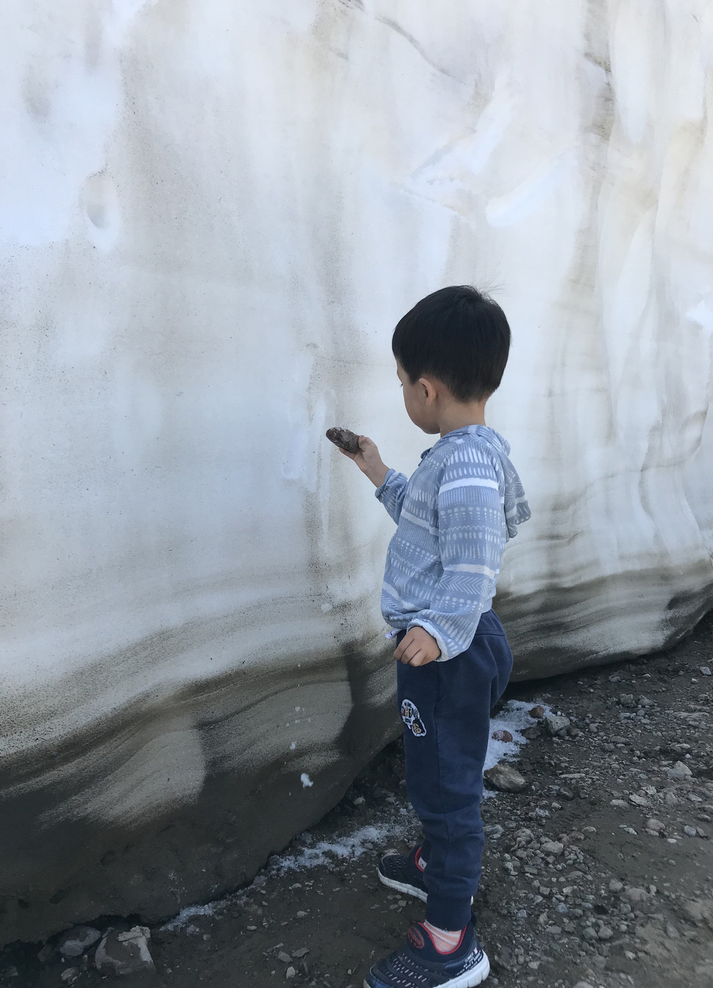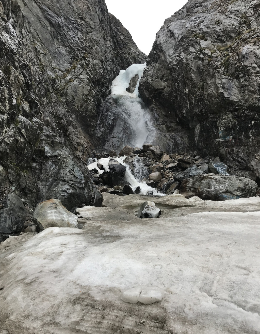 路边发现一处冰瀑,感觉倾流而下的水,是瞬间成冰的,远看还是流水的样子,走近才发现是冰,在这样的夏天,冰面冻得结结实实,也不知道什么时间冰雪才会消融,或许是7、8月,不过这冰面的厚度,即便消融也只是短暂的数日,多数时间这里依然还是冰雪的世界。