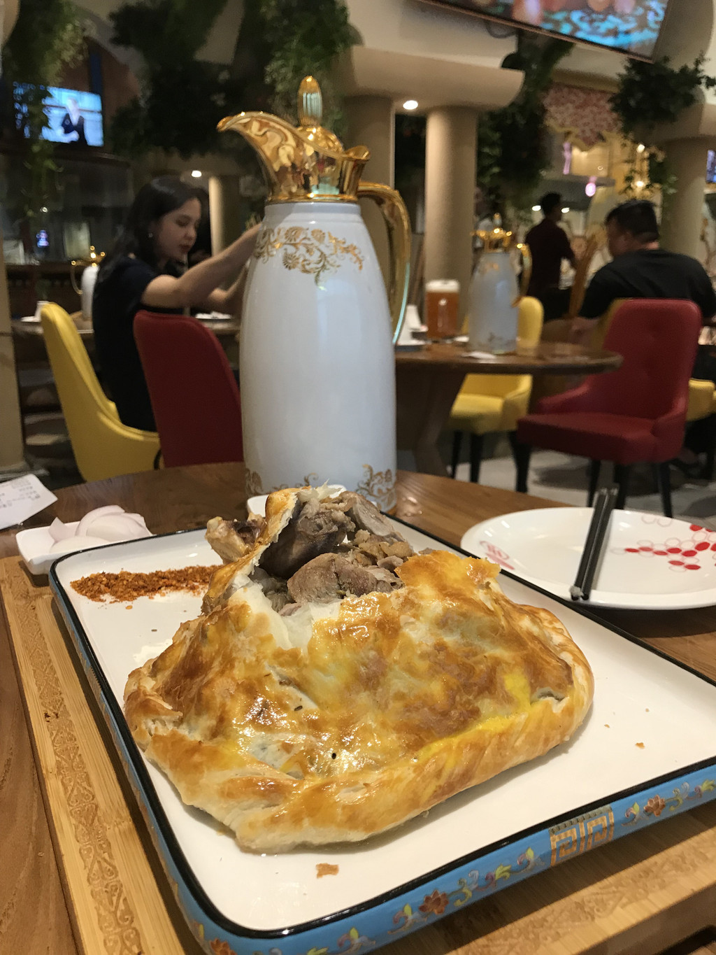 新疆特色菜“馕包肉”,顾名思义就是馕里面包着烤肉,确实好吃。有美食的地方大都有美女,乌鲁木齐也不例外,邻桌的大眼睛姑娘长得很新疆。