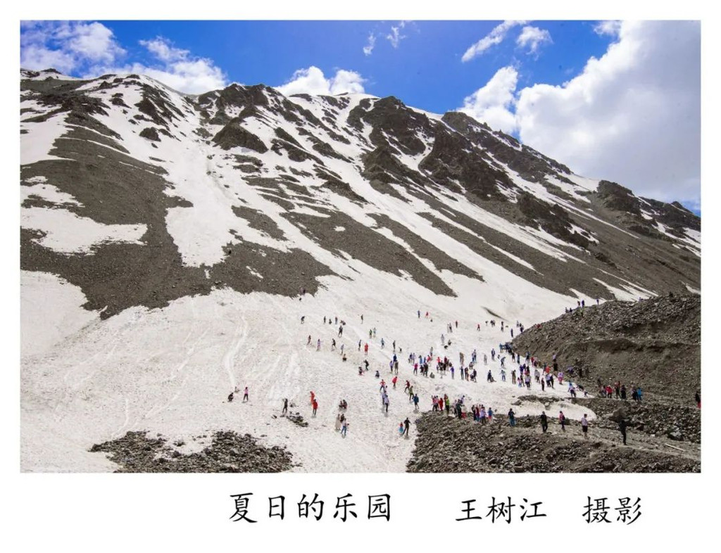 最后的行程是走独库公路北段,跨越天山南北。沿着弯弯曲曲的山路不断上升,雪山就渐渐到了脚下。仿佛触手可及的冰川,令人心旷神怡,感慨油然而生:“不畏浮云遮望眼,只缘身在最高层”!路边有几处两米多高的雪墙,在这7月的夏天,实属难得,我们兴奋地爬上去,在冰雪上玩耍,就像回到了童年。往前走还有一处“雪冠天山”景点,有几个足球场大的一片雪坡,成了夏季滑雪场,众多游客玩得不亦乐乎。