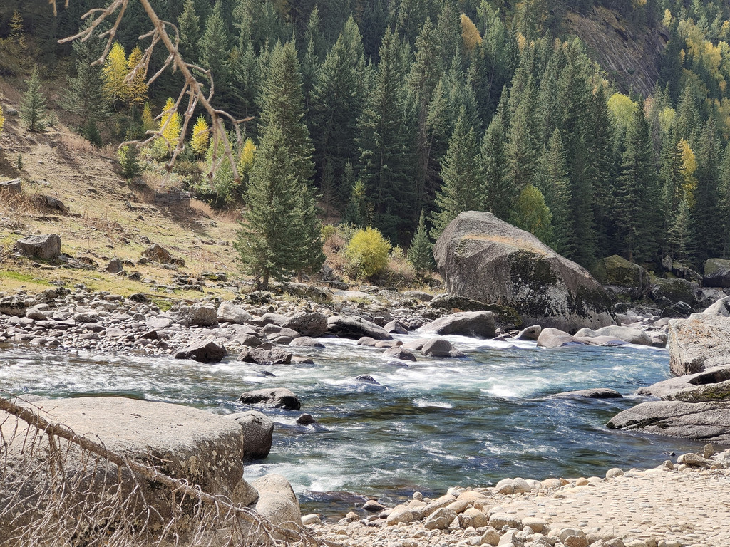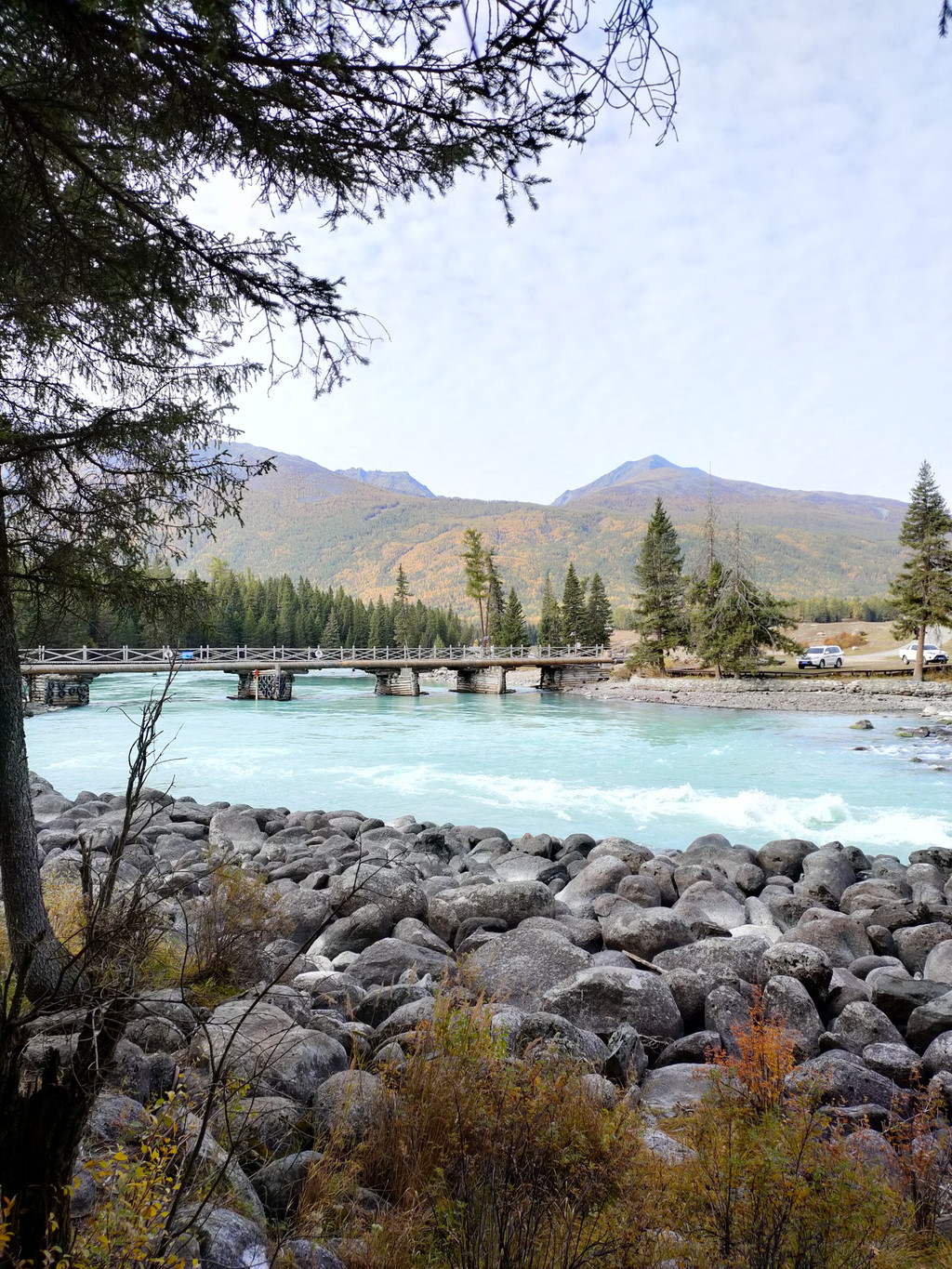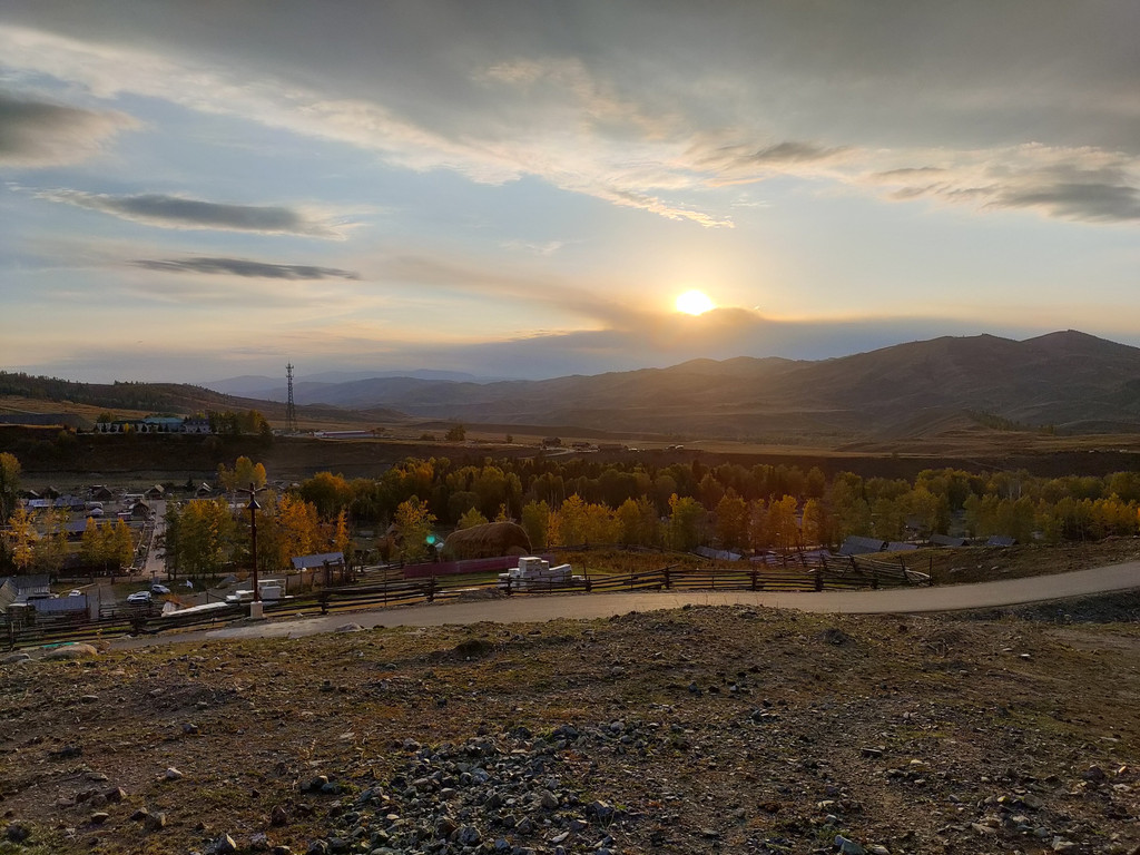 玩:可可托海景区需坐摆渡车进去,直接到核心景区神钟山。中间会在夫妻树这里停一下,让游客去拍照。后面一段到季兰德温泉可以步行,也可以坐景交车,但需要另外付费。峡谷风貌,介绍也可以在各大网站上查到。景区出来开车到布尔津路上很无聊,而且又是夕阳西下,阳光照着驾驶室,非常不舒服,在路上看了日落。整个景区我们玩了5小时。早餐从酒店去景区的路上非常漂亮,蜿蜒的额尔齐斯河,开始变黄的白桦林,色彩丰富。