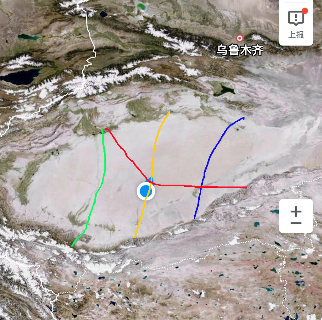 我们走的是民丰到轮台的(黄色)沙漠公路,也是第一条沙漠公路(塔里木沙漠公路)。红黄线交汇处就是塔中(沿途只有这里可以加油!)。