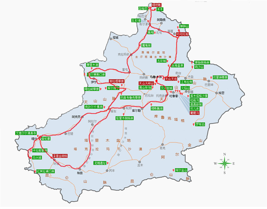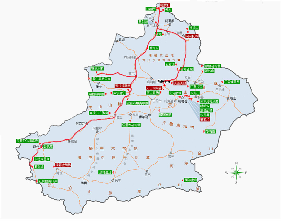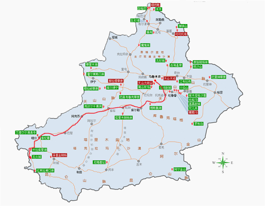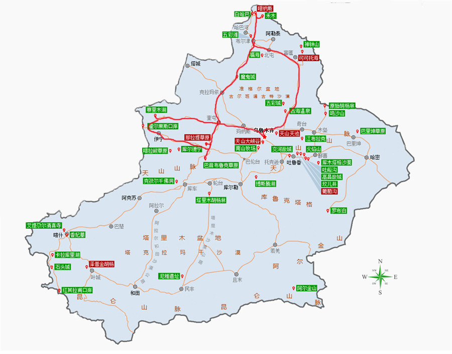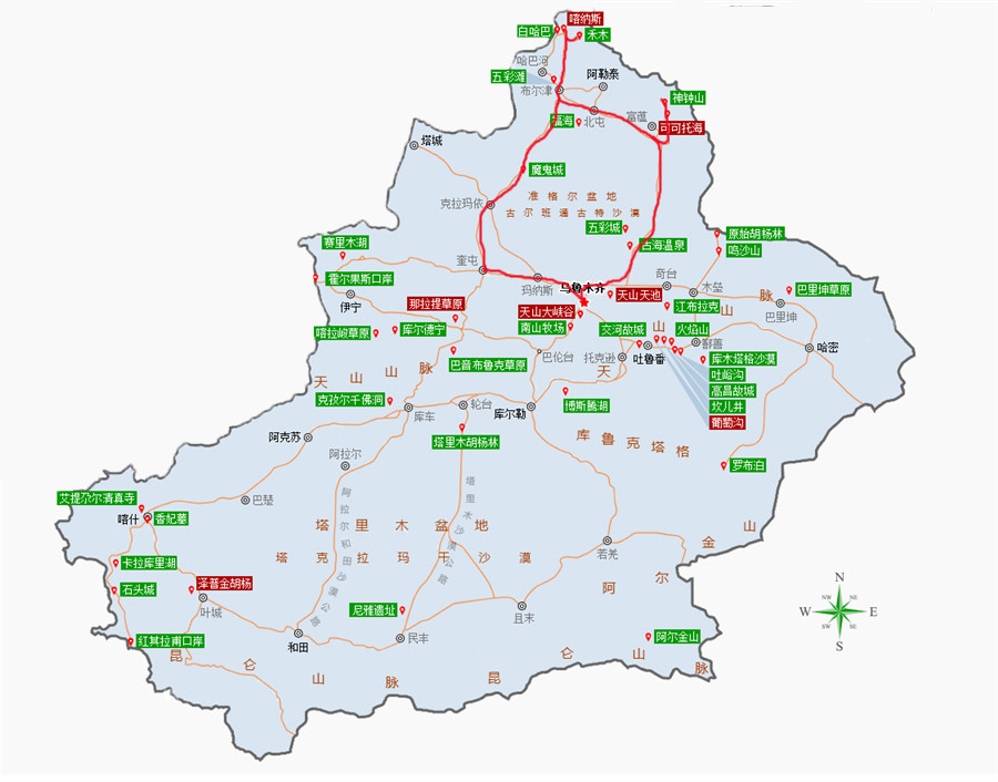 新疆的地理格局简单的说就是三山夹两盆 -- 三山指的是从北到南阿尔泰山、天山和昆仑山,两盆指的是夹在阿尔泰山和天山间的准噶尔盆地和夹在天山和昆仑山之间的塔里木盆地。 我们平时所说的南疆和北疆,就是以天山为界,天山以北为北疆,天山以南为南疆。 整个新疆的游玩北疆主要有北疆的喀纳斯线、伊犁线、吐鲁番线,以及南疆的帕米尔高原线、沙漠线等。