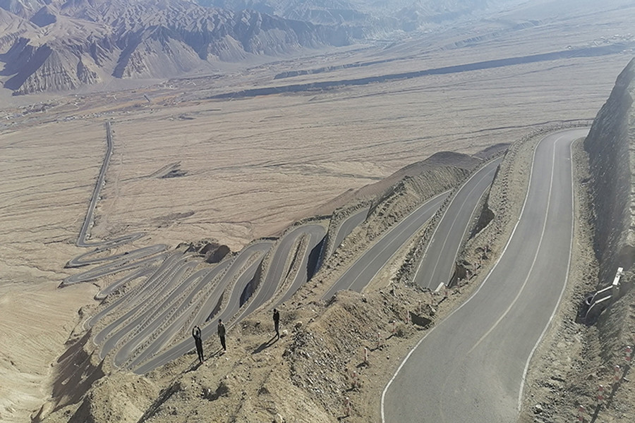 【塔县盘龙古道】:它横卧于昆仑山脉,海拔约4100千米左右,腾空远望像一条巨龙卧于山间,守望着这祖国西部的神山圣地。盘山公路超过600个S弯道,黝黑的新柏油路面像一笔勾勒出的山画墨宝。