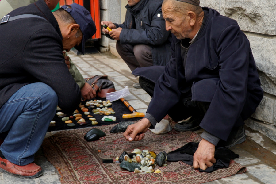 【和田玉石巴扎】:位于新疆和田玉龙喀什河大桥旁,也叫桥头石头巴扎,是新疆最大的和田玉籽料交易市场。